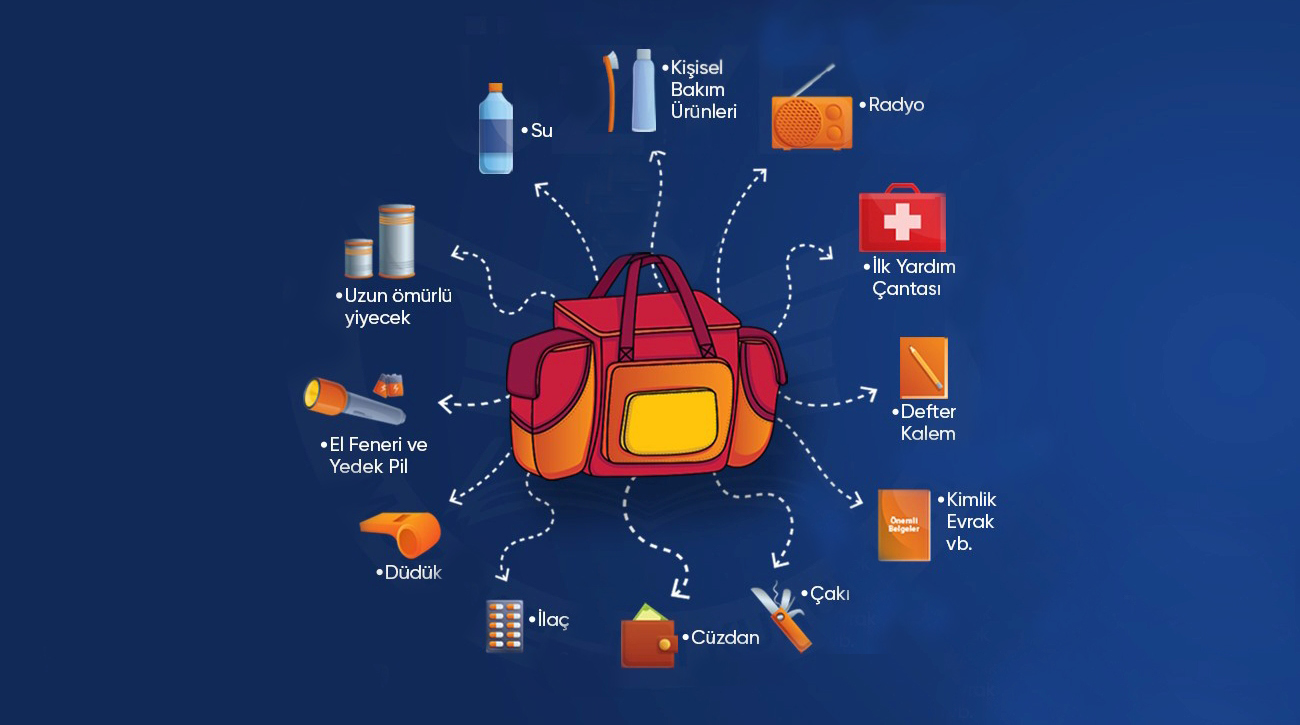 Deprem anında evden hemen çıkamayacağınız veya binaya dönemeyeceğiniz varsayımıyla, hayatta kalma sürenizi uzatacak bir çanta hazırlayın. Bozulmayan gıdalar (konserve, kuru meyve) ve yeterli miktarda içme suyu (kişi başı en az 3 günlük), pilli radyo, el feneri ve yedek piller. Temel ilaçlar, ilk yardım kiti ve varsa düzenli kullanılan reçeteli ilaçlar. Kimlik, tapu, sigorta poliçeleri gibi önemli belgelerin kopyalarını su geçirmez bir zarf içinde saklayın.