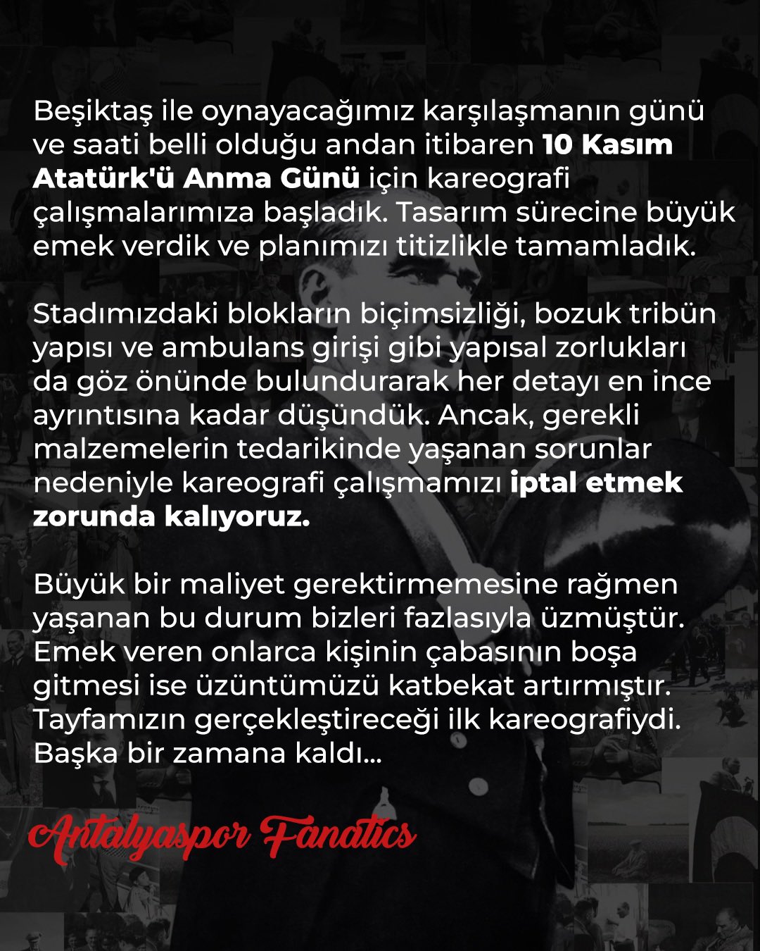 Fanatics’ten yapılan açıklamada, “Beşiktaş ile oynayacağımız karşılaşmanın günü ve saati belli olduğu andan itibaren 10 Kasım Atatürk’ü Anma Günü için kareografi çalışmalarımıza başladık. Tasarım sürecine büyük emek verdik ve planımızı titizlikle tamamladık. Stadımızdaki blokların biçimsizliği, bozuk tribün yapısı ve ambulans girişi gibi yapısal zorlukları da göz önünde bulundurarak her detayı en ince ayrıntısına kadar düşündük. Ancak, gerekli malzemelerin tedarikinde yaşanan sorunlar nedeniyle kareografi çalışmamızı iptal etmek zorunda kalıyoruz. Büyük bir maliyet gerektirmemesine rağmen yaşanan bu durum bizleri fazlasıyla üzmüştür. Emek veren onlarca kişinin çabasının boşa gitmesi ise üzüntümüzü katbekat artırmıştır. Tayfamızın gerçekleştireceği ilk kareografiydi. Başka bir zamana kaldı” ifadeleri kullanıldı.