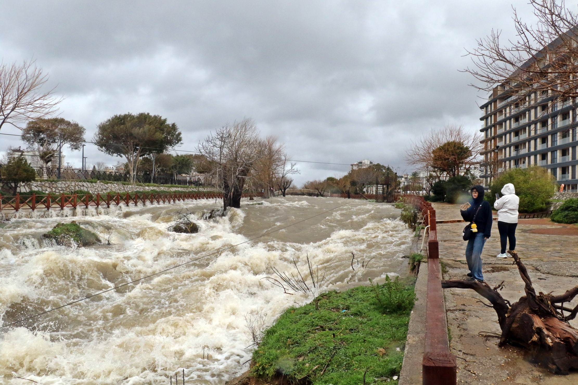 Meteorolojinin sağanak ve fırtına uyarısında bulunduğu Antalya'da dün gece saatlerinde başlayan yağış, sabah saatlerinde de devam etti. Öğle saatlerinde kentte yağış dururken, kapalı bir hava hakim oldu. Son 2 haftadır etkili olan yağışlar nedeniyle, dünyaca ünlü Düden Şelalesi'nin denizle buluştuğu alanda görsel şölen oluştu. Sağanak nedeniyle adeta çamur çağlayan şelale, denizin rengini de kahverengiye bürüdü. Güneyden esen şiddetli rüzgar, şelalenin denizle buluştuğu alanda suyu tersine döndürdü. Yağış olmamasına rağmen şelaleye gelen turistler ise bu sulardan nasibini aldı. Oluşan manzarayı hayranlıkla izleyen turistler, bol bol fotoğraf çekindi.