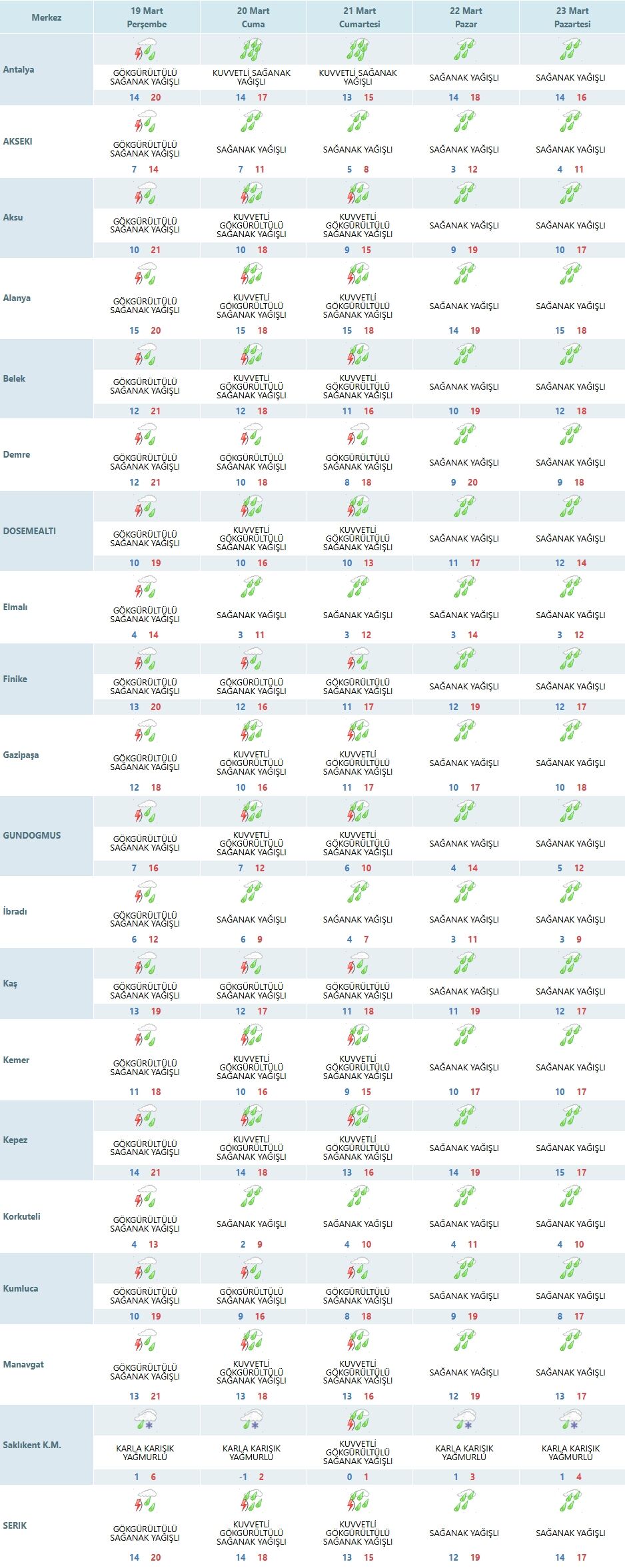 İlçelerde de benzer bir tablo öne çıkıyor. Alanya, Manavgat ve Serik gibi sahil ilçelerinde gök gürültülü sağanak yağış görülmesi beklenirken, iç kesimlerde yağışın daha sert hissedilebileceği belirtiliyor. Akseki ve İbradı gibi yüksek kesimlerde sıcaklık daha düşük olacak ve yağışlar daha etkili hissedilecek.