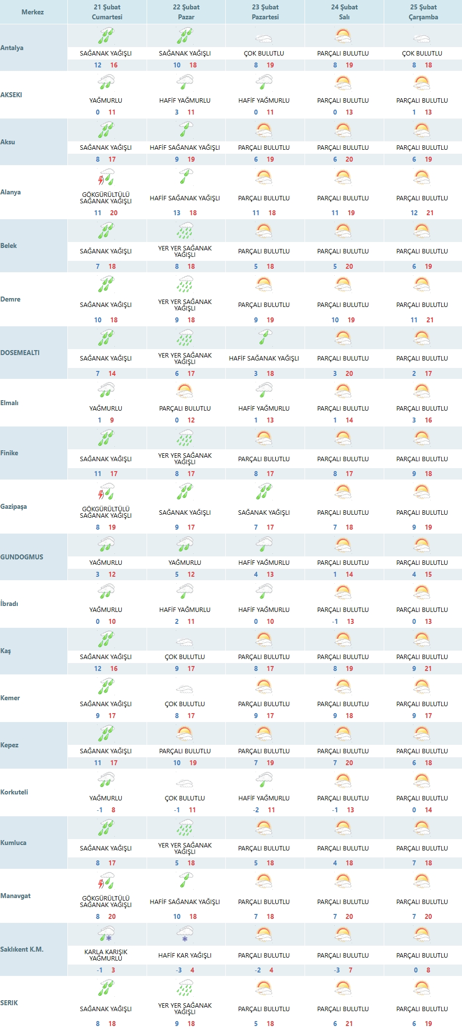 Pazar günü yağışlı sistem Antalya üzerindeki etkisini kısmen hafifletiyor. Şehir merkezinde sağanak yağışların devam etmesi beklenirken, sıcaklığın 10 ile 18 derece arasında ölçüleceği tahmin ediliyor. Aksu, Alanya ve Manavgat gibi noktalarda yağışlar hafif sağanağa dönerken; Belek, Demre, Döşemealtı, Finike, Kumluca ve Serik ilçelerinde ise yağışların "yer yer sağanak" şeklinde görülmesi öngörülüyor. İç kesimlerdeki Elmalı'da havanın parçalı bulutluya dönmesi beklenirken, Saklıkent Kayak Merkezi’nde hafif kar yağışının devam edeceği ve sıcaklıkların sıfırın altında 3 dereceye kadar gerileyeceği bildirilmiştir.