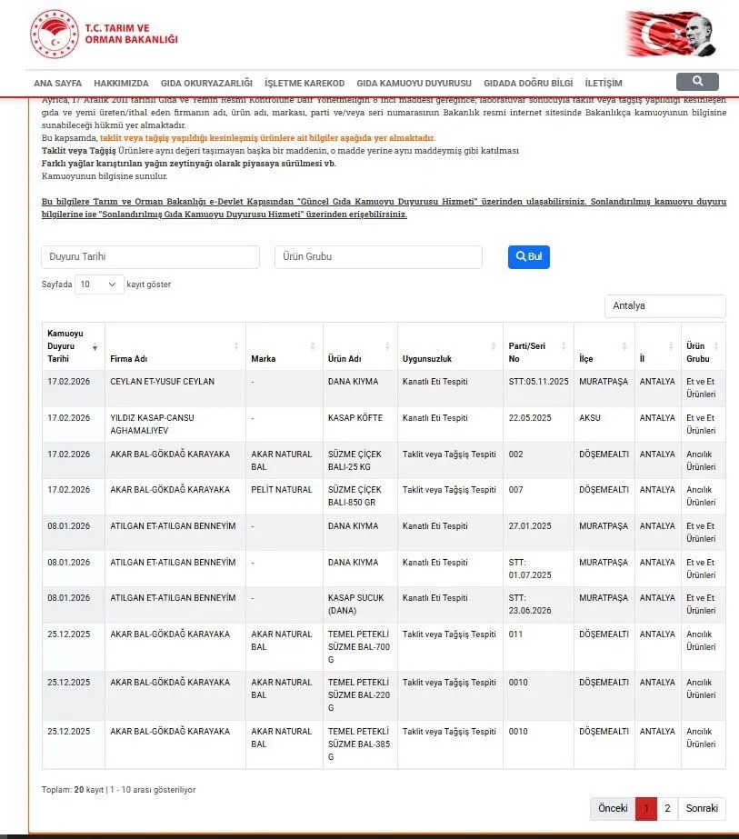 Listede yer alan bir diğer işletme ise Döşemealtı ilçesindeki Akar Bal oldu. Yapılan analizlerde süzme çiçek balı ürününde taklit ve tağşiş yapıldığı açıklandı.