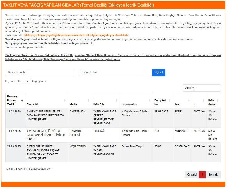 Serik’te üretim yapan Akdeniz Süt Ürünleri’ne ait Cheeseman markalı bazı peynir çeşitlerinde de mevzuata aykırılıklar tespit edildi. Yarım yağlı taze Çerkez peyniri ve eritme peynir ürünlerinde yağ oranının belirtilen değerlerin altında olduğu bildirildi.