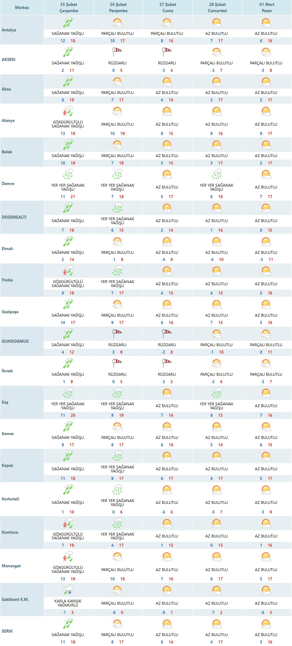 Yağışların kıyı kesimlerinde daha şiddetli olması bekleniyor. Alanya, Finike, Kumluca ve Manavgat ilçelerinde gök gürültülü sağanak yağışların etkili olacağı tahmin edilmektedir. Manavgat ve Alanya çevresinde en yüksek sıcaklıklar 18-19 derece civarında ölçülürken, Finike ve Kumluca hattında da benzer değerler görülecektir. Demre ve Kaş ilçelerinde ise yağışların "yer yer sağanak" şeklinde daha bölgesel kalacağı öngörülmektedir.