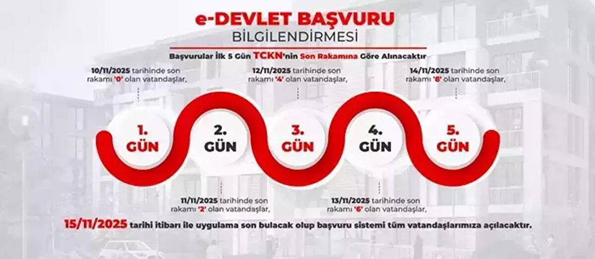 Vatandaşların başvuru yoğunluğunu yönetmek amacıyla Çevre, Şehircilik ve İklim Değişikliği Bakanlığı ve TOKİ Başkanlığı tarafından kademeli başvuru sistemi hayata geçirildi. 10 Kasım'da T.C. kimlik numarası 0 ile, 11 Kasım'da 2, 12 Kasım'da 4, 13 Kasım'da 6 ve 14 Kasım'da 8 ile bitenler e-Devlet üzerinden işlemlerini tamamlayacak. 15 Kasım 2025 tarihinden itibaren ise sistem tüm vatandaşların başvurusuna açık olacak. Başvuru süreci 19 Aralık 2025 tarihinde sona erecek. Proje için Ziraat Bankası, Halkbank ve Emlak Katılım Bankası da hazırlıklarını tamamladı.