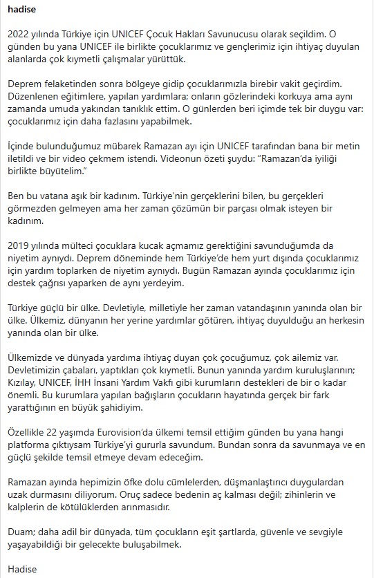 Tepkilerin büyümesi üzerine Hadise sosyal medya hesabından uzun bir açıklama yaptı. UNICEF ile 2022 yılından bu yana resmi olarak çalıştığını hatırlattı.