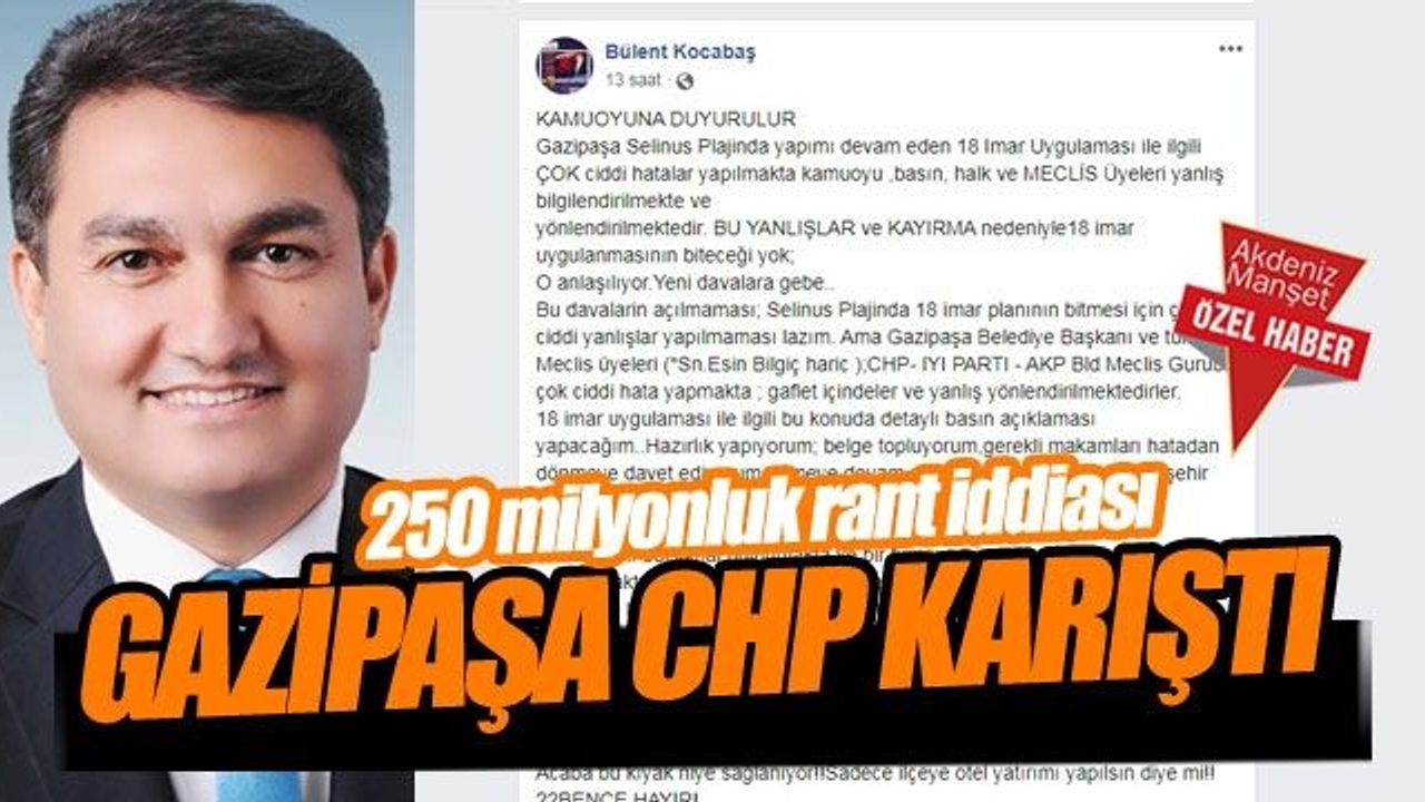 Antalya Gazipaşa’da Selinus Plajını kapsayan 18 İmar Uygulamasında çok ciddi hatalar yapıldığını iddia eden Bülent Kocabaş; kamuoyu, basın, halk ve meclis üyelerinin yanlış bilgilendirildiğini öne sürdü. Bir otel yatırımcısının dağın dibindeki çeşitli ada ve parsellerdeki arazisinin, otel yapımı adı altında denize yakın bir paftaya toplanmak suretiyle usulsüzlük yapıldığını öne süren Kocabaş, “Sayın Büyükşehir Belediye Başkanımıza konu aktarılmıştır. Kendisinden bu konuyu mercek altına almasını ve bu kanunsuz planı onaylamamasını istedik" dedi. CHP Gazipaşa eski İlçe Başkanı turizmci Bülent Kocabaş, açıklamalarında Gazipaşa Belediye Başkanı CHP’li Mehmet Ali Yılmaz’ı ağır bir dille eleştirdi ve çeşitli suçlama ve iddialarda bulundu.