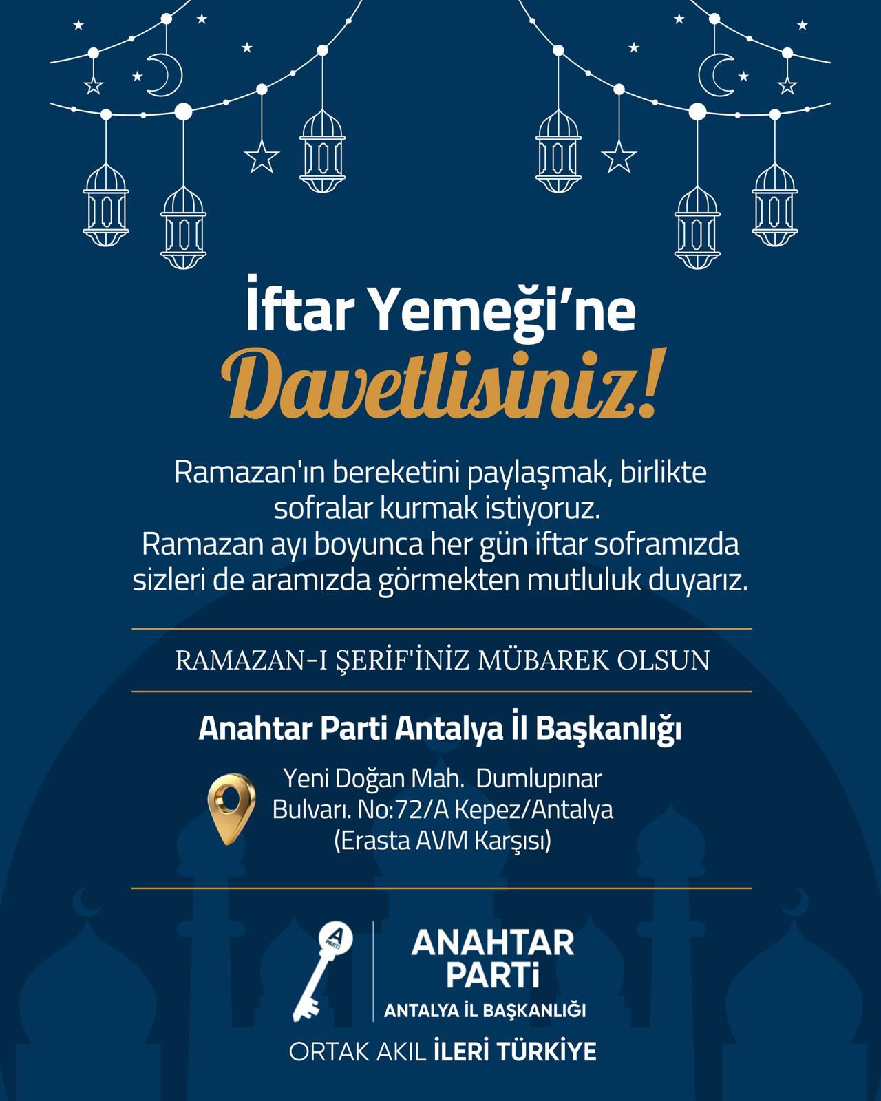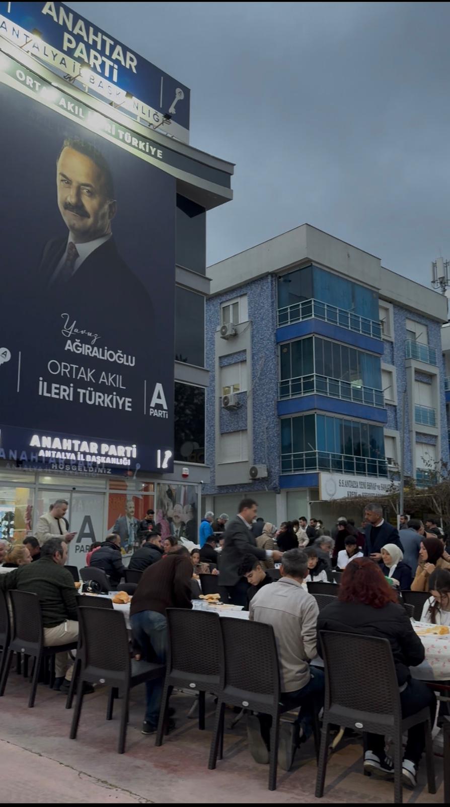 Farklı görüşlere sahip vatandaşların aynı masa etrafında buluştuğu iftarlar, "ortak akıl" anlayışının sahaya yansıması olarak dikkat çekiyor. Vatandaşlar iftarlarını açarken; talep, öneri ve görüşlerini doğrudan parti yetkililerine iletme fırsatı buluyor. Ramazan ayının birleştirici gücüne vurgu yapan Anahtar Parti Antalya İl Başkanı Mustafa Güneş, dayanışma mesajı vererek şunları kaydetti: “Bu sofralar sadece bir yemek sofrası değil, gönüllerin birleştiği birlik sofralarıdır. Ramazan; paylaşmak ve dayanışmaktır. Biz burada siyasi görüş ayrımı yapmaksızın tüm Antalyalı hemşerilerimizi misafir ediyoruz. Soframızın kapısı herkese sonuna kadar açıktır.” Ramazan ayı boyunca aralıksız devam edecek olan iftar programları, Antalya’da toplumsal kaynaşmanın en önemli buluşma noktalarından biri haline geldi. İl Başkanlığı, tüm Antalyalıları bu manevi atmosferi paylaşmaya ve ‘Gönül Sofrası’na konuk olmaya davet ediyor.