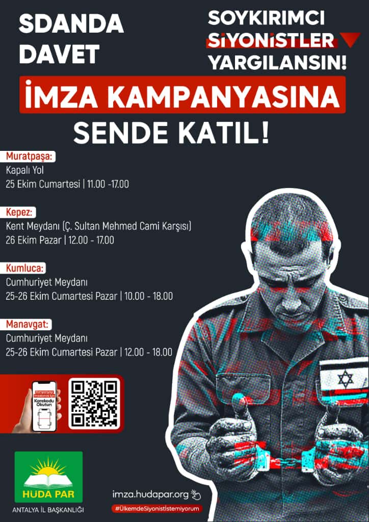 Durmaz, kampanyanın takvimine ilişkin de bilgi vererek, “25 Ekim Cumartesi günü Muratpaşa Kapalı Yol’da, 26 Ekim Pazar günü Kepez Kent Meydanı’nda, ayrıca 25-26 Ekim tarihlerinde Kumluca ve Manavgat ilçelerimizin Cumhuriyet Meydanı’nda stantlarımız açık olacak” ifadelerini kullandı. Antalyalıları kampanyaya katılmaya davet eden Durmaz, “Soykırım suçlularının adalet önünde hesap vermesi için hep birlikte üzerimize düşeni yapmaya devam edeceğiz” diye konuştu.