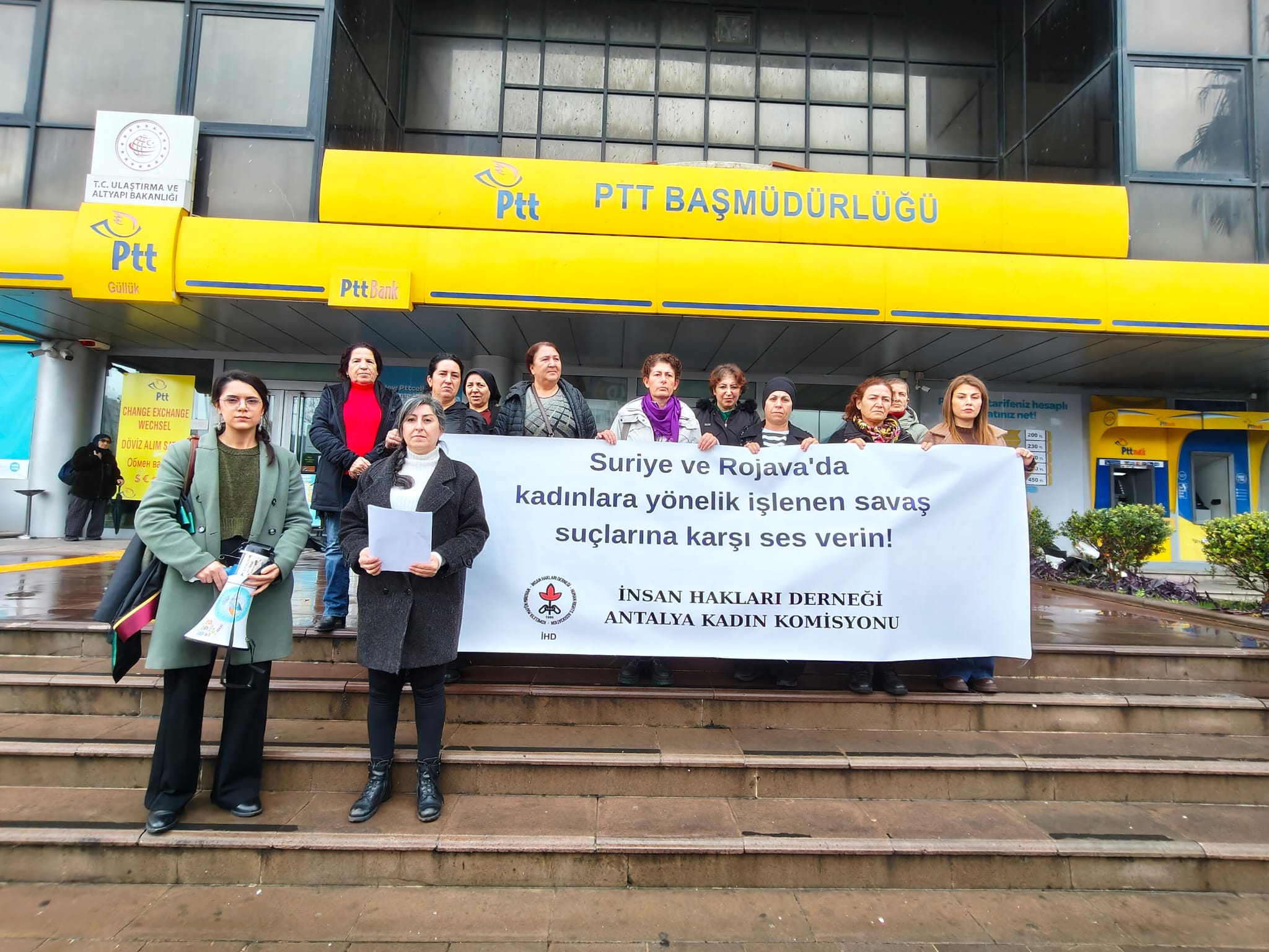 Komisyon üyeleri, hazırladıkları acil çağrı metnini Birleşmiş Milletler ve ilgili uluslararası kurumlara posta yoluyla gönderdi. Patlak: Güllük PTT önünde gerçekleştirilen eylemde basın metnini İHD Antalya Kadın Komisyonu adına Semra Yeşilyurt okudu. Açıklamada; Suriye’de faaliyet yürüten HTŞ bağlantılı grupların Alevi, Dürzi, Kürt ve Ermeni halklarına yönelik saldırılarının sistematik bir boyuta ulaştığı vurgulandı. Özellikle kadınların ve kız çocuklarının bu süreçte savaş suçlarının doğrudan hedefi haline geldiği belirtildi.