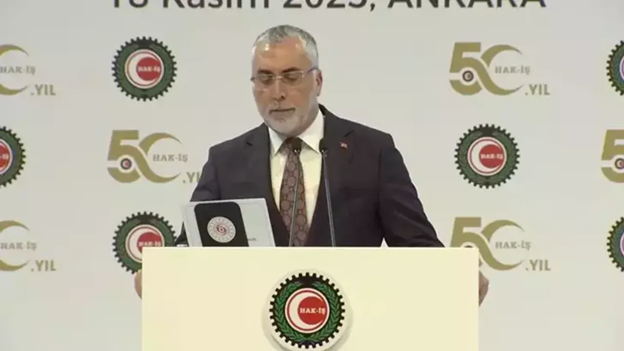 İşçilerde sendikalaşma oranının yüzde 9,21 oranından 2025 yılı itibarıyla yüzde 14,02 seviyelerine yükseldiğini belirten Bakan Işıkhan, "Noter şartı, prosedürel engeller, iş yeri tespiti gibi meseleleri sadeleştirdik. Toplu sözleşme süreçlerini daha öngörülebilir, daha düzenli ve daha kapsayıcı bir yapıya kavuşturduk. Çalışma hayatında karar alma süreçlerinin odağına paydaşlarımızı da katarak, sosyal diyalog mekanizmalarını güçlendirdik. Son dönemde; Çalışma Meclisi, Üçlü Danışma Kurulu ve Kamu Personeli Danışma Kurulu gibi mekanizmaları yeniden çalışma hayatının merkezine aldık. Biz her zaman şunu söylüyoruz; işçi olmadan işveren olmaz, işveren olmadan üretim olmaz, üretim olmadan da güçlü Türkiye olmaz. Ve devlet, bu denklemin adaletini sağlayan ana eksendir. Bu eksende çalışma hayatımızı her alanda güçlendirmeye, emeğin hakkını korumaya; sosyal güvenliği daha adil, daha sürdürülebilir ve daha güçlü bir yapıya kavuşturmaya kararlıyız. Türkiye Yüzyılı vizyonuyla; emeğin, üretimin ve sosyal adaletin yeni bir seviyeye taşınacağı güçlü bir dönemin başlangıcındayız. Şunu çok iyi biliyoruz; Türkiye, bugün her şeye rağmen büyümesini sürdüren, istihdamını artıran, üretim kapasitesini güçlendiren bir ülke haline geldiyse buna en büyük katkıyı sağlayan, bu salonda bulunan emekçi ve işçi kardeşlerimizdir. Ve yine işçilerimizin kutsal emekleri ve akıttığı alın teriyle Türkiye Yüzyılı; emeğin, üretimin, hakkın, adaletin, birlik ve beraberliğin yüzyılı olacaktır" diye konuştu.