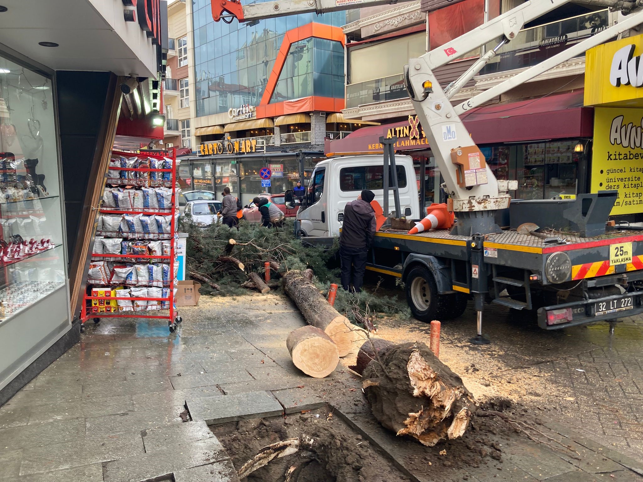 Yaşananları anlatan market sahibi Bilal Demir, "Dükkânda kahve içiyordum. Aşırı rüzgâr nedeniyle cips standım yerinden oynadı. Dışarı baktığımda yağmur yağıyordu ve stant giriş çıkışı engellemiyordu. Islanmamak için ‘yağmur durunca düzeltirim' diyerek tekrar yerime oturdum. Ancak bir anda içime bir his doğdu, tekrar standa bakma ihtiyacı hissettim. Tam dışarı adım atacakken ağaç bir anda devrildi. ‘Verilmiş sadakam varmış' diyorum. Allah'tan kimseye bir şey olmadı. Benim iş yerimde ve yan komşumun tabelasında maddi hasar oluştu, onun dışında ciddi bir durum yaşanmadı. Hayat kısa sürede normal akışına döndü. Eğer iki saniye daha erken davranıp standı düzeltmiş olsaydım muhtemelen ağaç üzerime devrilecekti. Sadaka vermeye inanırım, daha önce de ihtiyaç sahiplerine yardım etmişliğim oldu. Bundan sonra da daha fazla dikkat edeceğim" dedi.