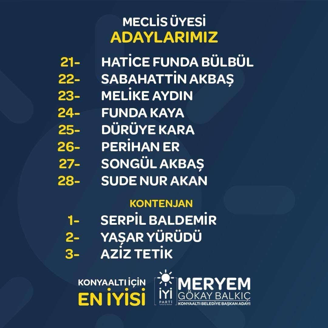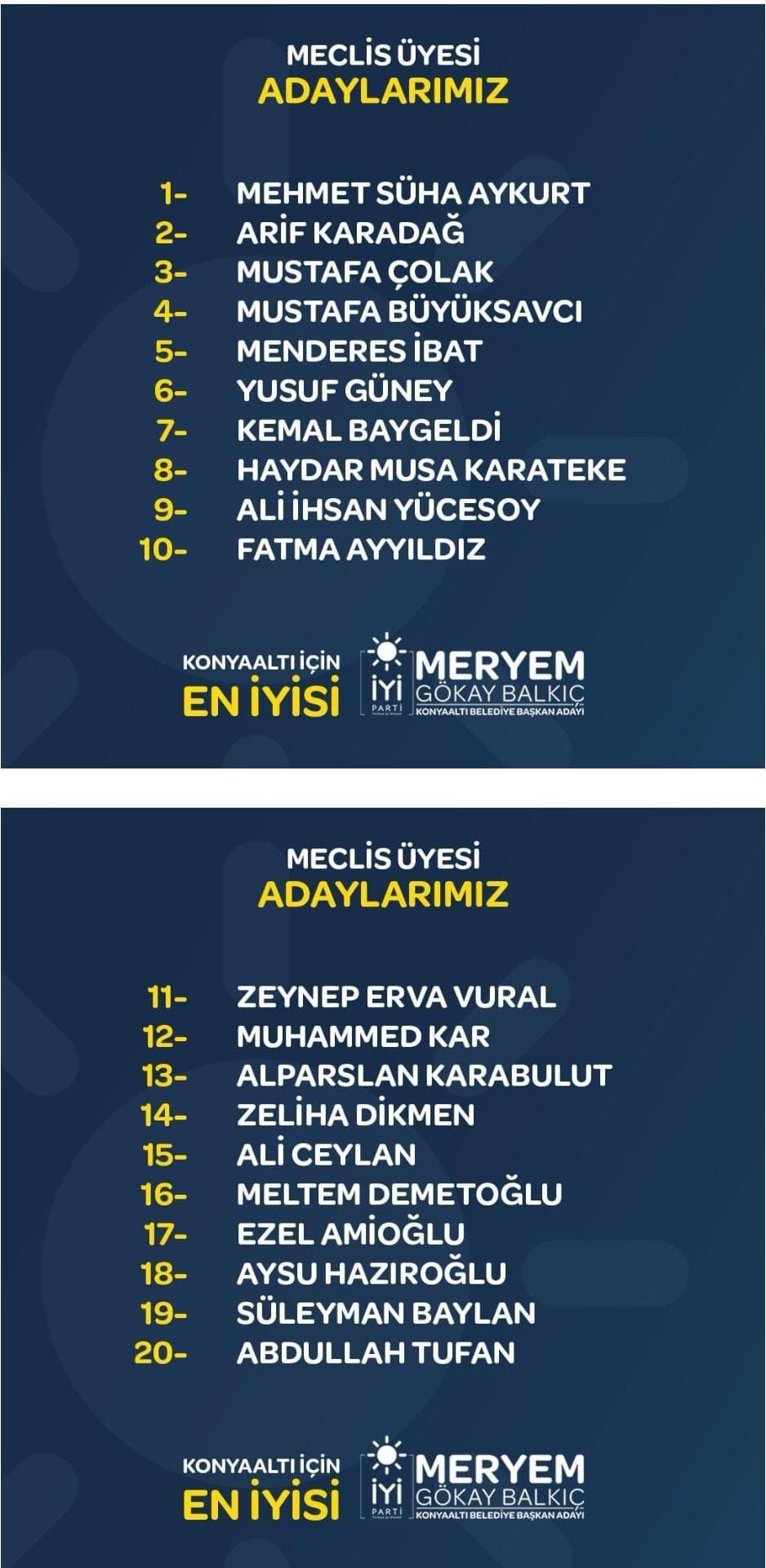 İYİ Parti, Konyaaltı ilçesinde yapılacak belediye meclis üyeliği seçimleri için adaylarını duyurdu. İşte meclis üyeliği için aday olan isimler:
