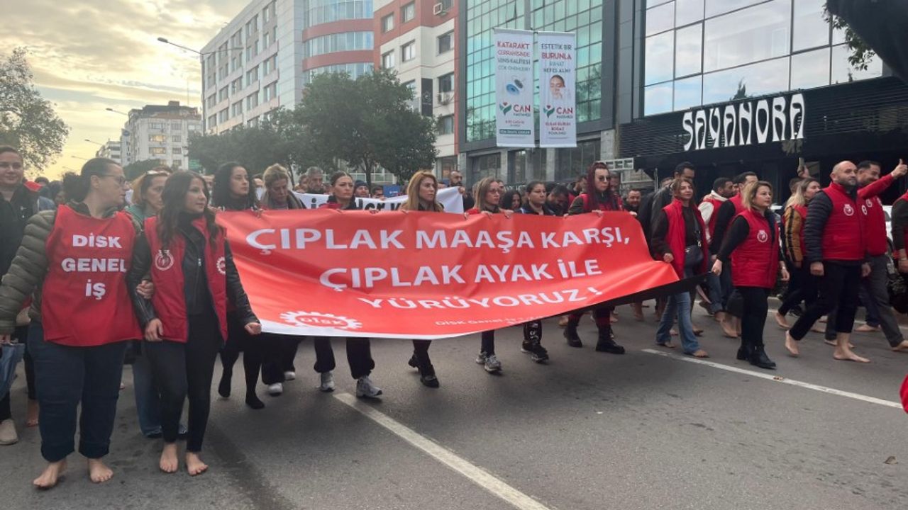 Devrimci İşçi Sendikaları Konfederasyonu’na (DİSK) bağlı Genel-İş Sendikası’nın İzmir’deki 1, 2, 3 ve 9 No’lu şubelerinin öncülüğünde, İzmir Büyükşehir Belediyesi’ne bağlı şirketlerde çalışan işçiler çıplak ayaklı eylem gerçekleştirdi. İZENERJİ, İZELMAN, İZFAŞ, EGEŞEHİR ve İZTEK şirketlerinden çok sayıda işçi, sendika binası önünde bir araya geldi. Burada toplanan grup, taleplerini duyurmak amacıyla Kültürpark’a doğru yürüyüşe geçti. İşçiler, maaşlarındaki kesintilere ve "çıplak ücret" olarak adlandırdıkları uygulamaya dikkat çekmek amacıyla ayakkabılarını çıkararak çıplak ayakla yürüyüş gerçekleştirdi. Eylem sırasında, "Hakkımız olanı istiyoruz," ve "Baskılar bizi yıldıramaz" gibi çeşitli sloganlar atıldı. Grup, yürüyüşlerini Kültürpark’ın 9 Eylül Kapısı’nda sonlandırdı. Burada toplanan işçiler, durumlarına ilişkin bir basın açıklaması düzenledi. Sendika adına basın açıklamasını okuyan DİSK Genel-İş İzmir 2 No’lu Şube Başkanı Ercan Gül, "İzmir Büyükşehir Belediyesi’ne bağlı İZENERJİ, İZELMAN, İZFAŞ, EGEŞEHİR ve İZTEK şirketlerinde çalışan binlerce işçi olarak bugün burada toplanmamızın sebebi çok açıktır. Toplu iş sözleşmemizin 37, 43 ve 44. maddelerinde açıkça yer alan öğrenim yardımı, ikramiye ve diğer sosyal haklarımız aylardır ödenmemektedir. Belediye yönetimi, aylardır sürdürdüğümüz tüm görüşmelere rağmen ne ödeme yapmış ne de somut bir ödeme takvimi açıklamıştır. Günlerdir belediye bürokratları maaşlarda herhangi bir sorun olmadığını söylemesine rağmen, maaş ödemesinden sadece bir gün önce bazı basın organlarında emekçilerin maaşlarının çıplak ücret olarak yatırılacağı haberi çıkmıştır. Maaşımıza yapılan bu saldırı nedeniyle kiralarımızı, kredilerimizi ve faturalarımızı ödeyemez hale geldik" ifadelerini kullandı.