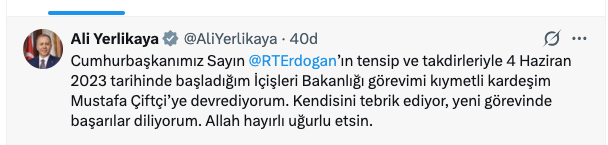 İçişleri Bakanı olan Ali Yerlikaya'nın yerine ise Mustafa Çiftçi atandı.