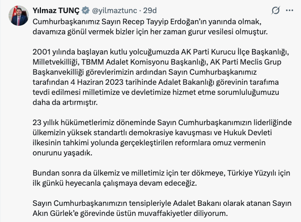 Adalet Bakanı olarak görev yapan Yılmaz Tunç, Cumhurbaşkanı Kararı ile görevden alındı. Yerine İstanbul Başsavcısı Akın Gürlek atandı.