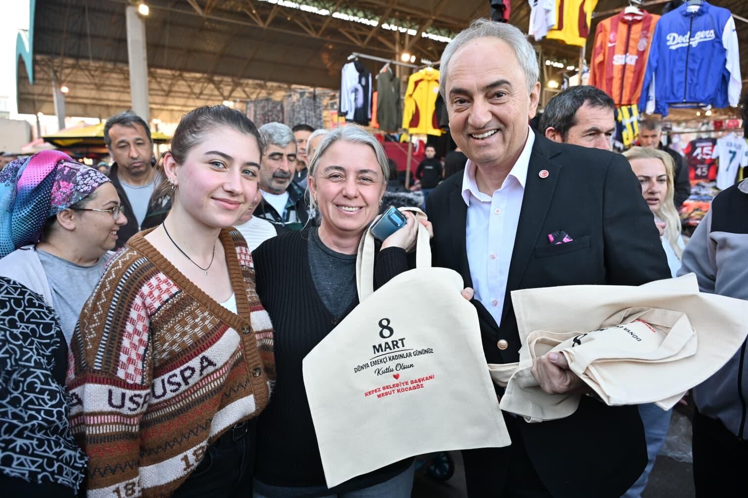 Kadınların toplumdaki rolünün önemine değinen Başkan Kocagöz, 8 Mart Dünya Emekçi Kadınlar Günü'nde Yeni Mahalle Semt Pazarı'nda kadınlarımızı ziyaret ettik. Kepez Belediyesi, tekstil atölyemizde bugüne özel ürettiğimiz çantaları ve şalları hediye ettik. Kadınlarımızın her zaman görünür olduğu, kendilerini güvende hissettikleri bir kent için çalışıyoruz. Hayatı birlikte paylaşıyor, onların dünyaya kattıkları güzellikleri bir kez olsun unutmuyoruz. Kadınların daima güldüğü, özgür birer birey olarak ön planda oldukları bir dünya diliyorum” dedi.