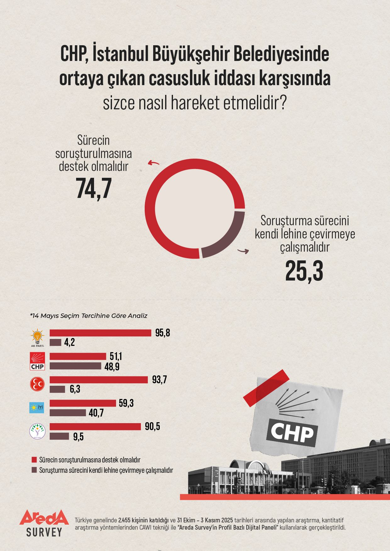 Areda Survey, İstanbul Büyükşehir Belediyesi’nde ortaya çıkan ‘casusluk’ iddiası sonrası kamuoyunun CHP’den nasıl bir tutum beklediğini araştırdı. Türkiye genelinde 2 bin 455 kişinin katılımıyla gerçekleştirilen araştırma dikkat çekici sonuçlar ortaya koydu. Araştırmaya göre toplumun büyük çoğunluğu, ‘casusluk’ iddialarının aydınlatılması için CHP’nin soruşturma sürecine destek olması gerektiğini düşünüyor. Katılımcıların yüzde 74,7’si bu yönde görüş bildirirken, yüzde 25,3’ü ise CHP’nin soruşturmayı kendi lehine çevirmeye çalışması gerektiğini ifade ediyor.
