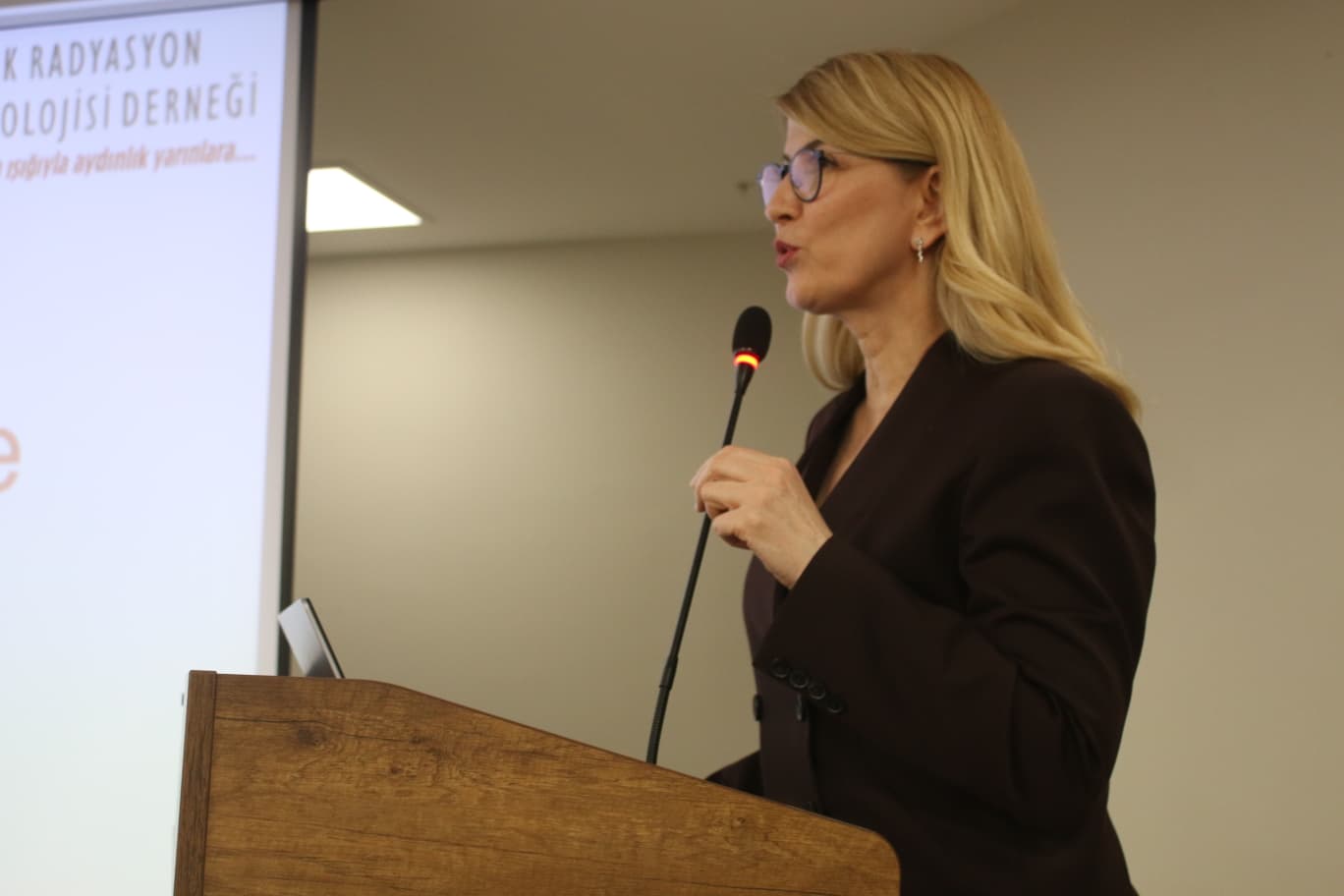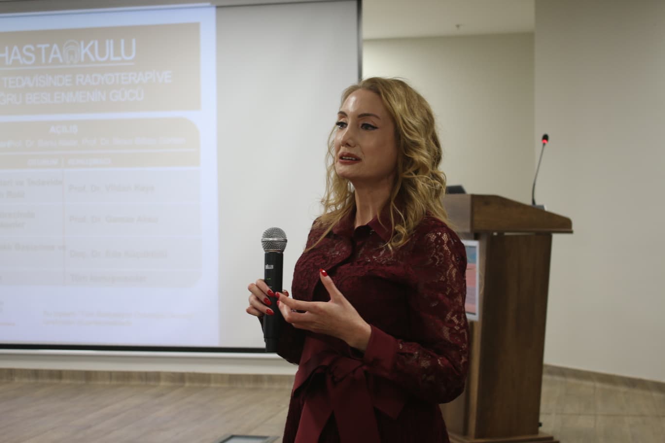Programın ikinci konuşmacısı Prof. Dr. Gamze Aksu, ‘Radyoterapi Sürecinde Bilmeniz Gerekenler’ başlıklı sunumunda radyoterapinin amaçlarını ve uygulama süreçlerini anlattı. Radyoterapinin temel hedefinin hastalığı tamamen tedavi etmek olduğunu belirten Aksu, ameliyat öncesinde tümörü küçültmek, ameliyat sonrasında ise tekrarlama riskini azaltmak amacıyla da uygulanabildiğini ifade etti. Ayrıca ağrı, nefes darlığı ve kanama gibi şikayetleri azaltmada da radyoterapinin önemli rol oynadığını söyledi. Tedavi sürecinin hasta ile yapılan ayrıntılı değerlendirme ve bilgilendirme ile başladığını aktaran Gamze Aksu, radyoterapi planlama aşamasının ardından tedavilerin büyük oranda gelişmiş cihazlarla uygulandığını belirtti. Gelişen teknolojinin, normal dokuların daha iyi korunmasına olanak sağladığını vurguladı. Yan etkilerin her hastada aynı olmadığını ve genellikle tedavi edilen bölgeye özgü olduğunu ifade eden Prof. Dr. Aksu, en sık görülen yan etkiler arasında yorgunluk, cilt reaksiyonları ve mukozit bulunduğunu söyledi. Radyoterapinin ikinci haftasından itibaren ciltte kızarıklık, hassasiyet, kuruluk ve kaşıntı gibi belirtilerin görülebileceğini belirten Aksu, bu süreçte hijyen, uygun giyim ve güneşten korunmanın önemine dikkat çekti. Mukozit ve özefajit durumlarında yumuşak, sıvı ve ılık gıdaların tercih edilmesi gerektiğini ifade eden Aksu, bol su tüketimi ve ağız bakımının da tedavi sürecinde büyük önem taşıdığını vurguladı. Yan etkilerin büyük bölümünün geçici olduğunu belirten Aksu, düzenli kontrollerin ihmal edilmemesi gerektiğini söyledi.