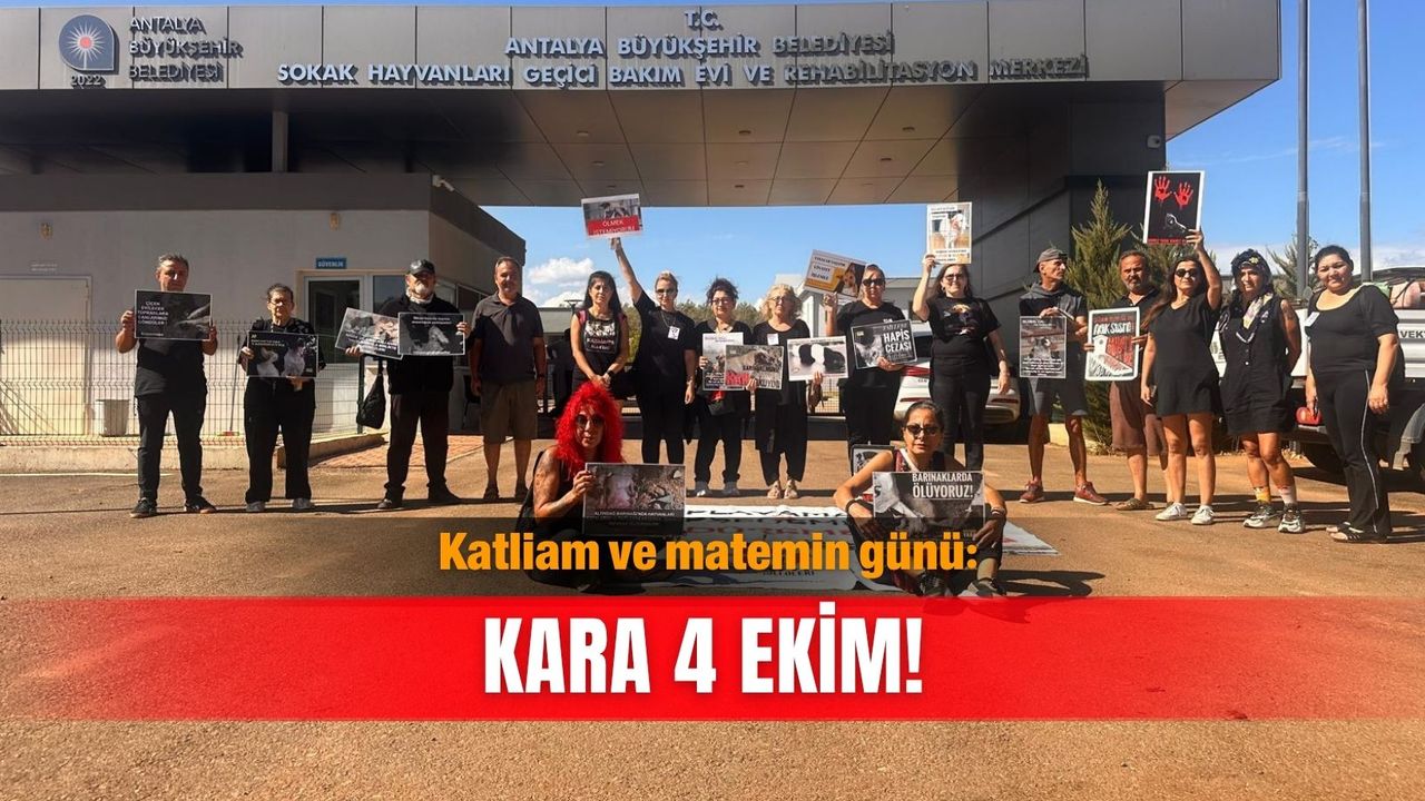 4 Ekim Dünya Hayvanları Koruma Günü, Türkiye’nin dört bir yanında bu yıl “matem ve lanet günü” olarak anıldı. Ulusal Hayvan Hakları Birliği öncülüğünde, yurdun birçok kentinde barınakların önünde basın açıklamaları ve alan ziyaretleri gerçekleştirildi. Eylemlere katılan hayvanseverler siyah kıyafetlerle katliamı protesto ederken, “doğal yaşam alanı” adı altında oluşturulan yerlerin “doğal cehennem alanları”na dönüştüğünü dile getirdi. Antalya’daki hayvanseverler de Antalya Büyükşehir Belediyesi Sokak Hayvanları Geçici Bakımevi ve Rehabilitasyon Merkez önünde bir araya gelerek siyah çelenk bıraktı basın açıklaması gerçekleştirdi. Ardından da Kapalıyol ‘da buluşup Atktalos meydanında basın açıklaması yaptı. Antalya’daki etkinlikte grup adına açıklamayı Eda Zorluoğulları okudu. Zorluoğulları, 4 Ekim’in artık kutlanacak bir gün değil, öldürülen hayvanların anıldığı bir yas günü olduğunu belirtti.