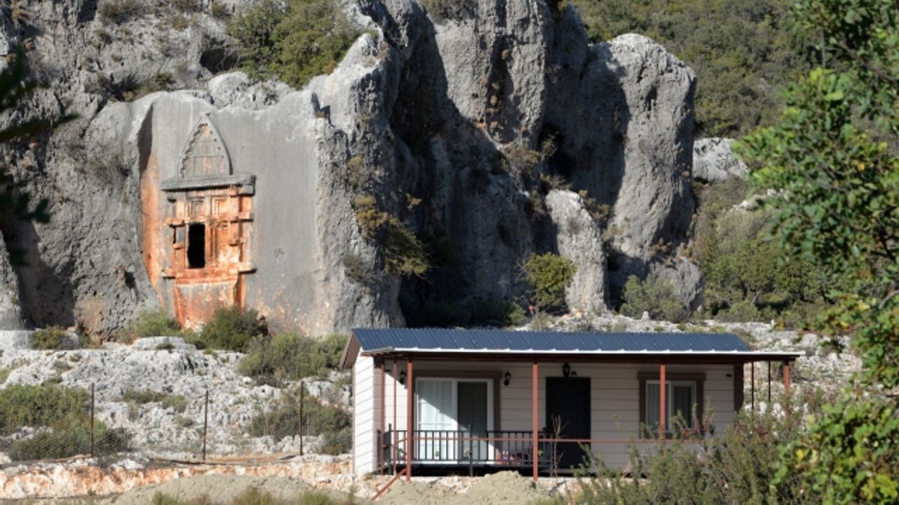 İlçenin Çevreli Mahallesi'nde tahrip edilmiş haldeki bir kaya mezarının önüne ise prefabrik ev yapıldı. Daha önce defineciler tarafından tahrip edilen binlerce yıllık kaya mezarın yaklaşık 10 metre önündeki alanı telle çeviren kişi, prefabrik evde ailesiyle yaşamaya başladı. Demre Belediyesi'nin evin kaldırılmasına yönelik yaptığı tebligatlara rağmen kaya mezarın görünüşünü engelleyen ev kaldırılmadı.