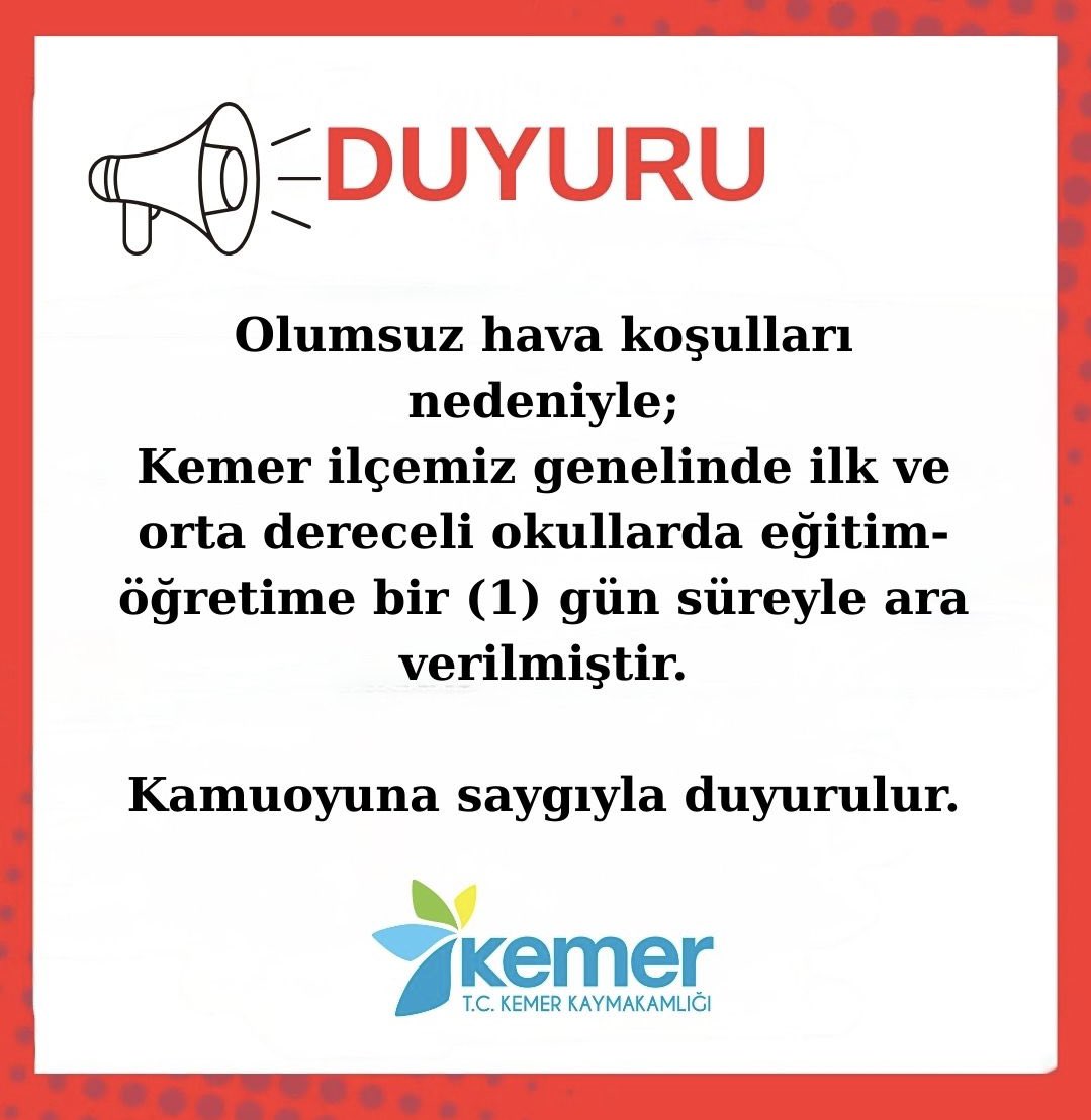 Antalya’nın Kemer ilçesinde etkili olan olumsuz hava koşulları nedeniyle eğitime 1 gün ara verildi. Kemer Kaymakamlığı tarafından yapılan açıklamada, ilçe genelindeki ilk ve orta dereceli okullarda eğitim-öğretime bir (1) gün süreyle ara verildiği bildirildi.