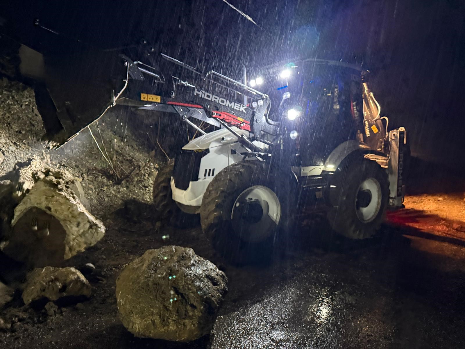 Kemer Belediye Fen İşleri Müdürlüğü ekipleri, istinat duvarının çöktüğü bölgeye ulaşarak trafiğe kapanan yolu belediye araçlarıyla açtı.