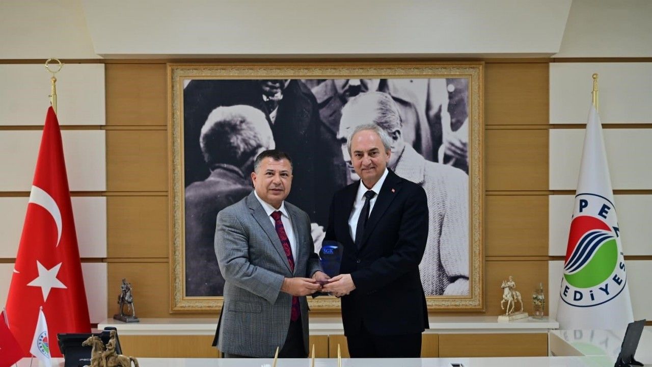 Kepez Belediyesi’nin mali disiplini ve başarılı bütçe yönetimi, SGK’ya yönelik yükümlülüklerin yerine getirilmesinde de önemli bir başarı tablosunu ortaya koydu. Kepez Belediyesi, SGK prim ve diğer yasal ödemelerini tam ve eksiksiz şekilde gerçekleştirerek örnek bir kamu yönetimi sergiledi. SGK Antalya İl Müdürü Mehmet Tanrıöver, Kepez Belediye Başkanı Mesut Kocagöz’ü makamında ziyaret ederek, düzenli pirim ödemelerinden dolayı teşekkür plaketi takdim etti. Kepez Belediye Başkanı Mesut Kocagöz de nazik ziyaretlerinden dolayı SGK İl Müdürü Tanrıöver’e teşekkür etti.