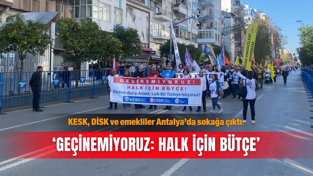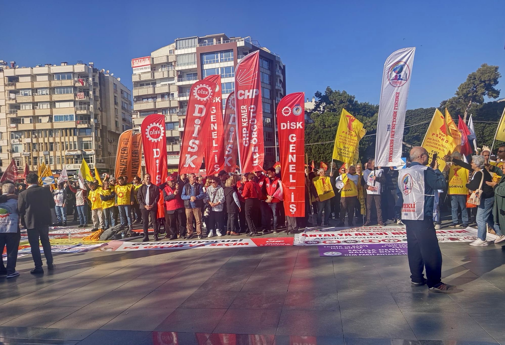 2026 bütçe görüşmelerinin başlamasıyla birlikte Antalya’da Kamu Emekçileri Sendikaları Konfederasyonu (KESK), Devrimci İşçi Sendikaları Konfederasyonu (DİSK) ve Türkiye Emekliler Sendikası ve çeşitli siyasi parti temsilcileri tarafından protesto eylemi düzenlendi. Aydın Kanza Parkı önünde başlayan yürüyüş, Güllük Caddesi üzerinden Cumhuriyet Meydanı’nda sona erdi. Meydanda toplanan emekçiler, asgari ücret, emekli maaşları ve çalışma koşullarına yönelik adalet taleplerini sloganlarla dile getirdi.