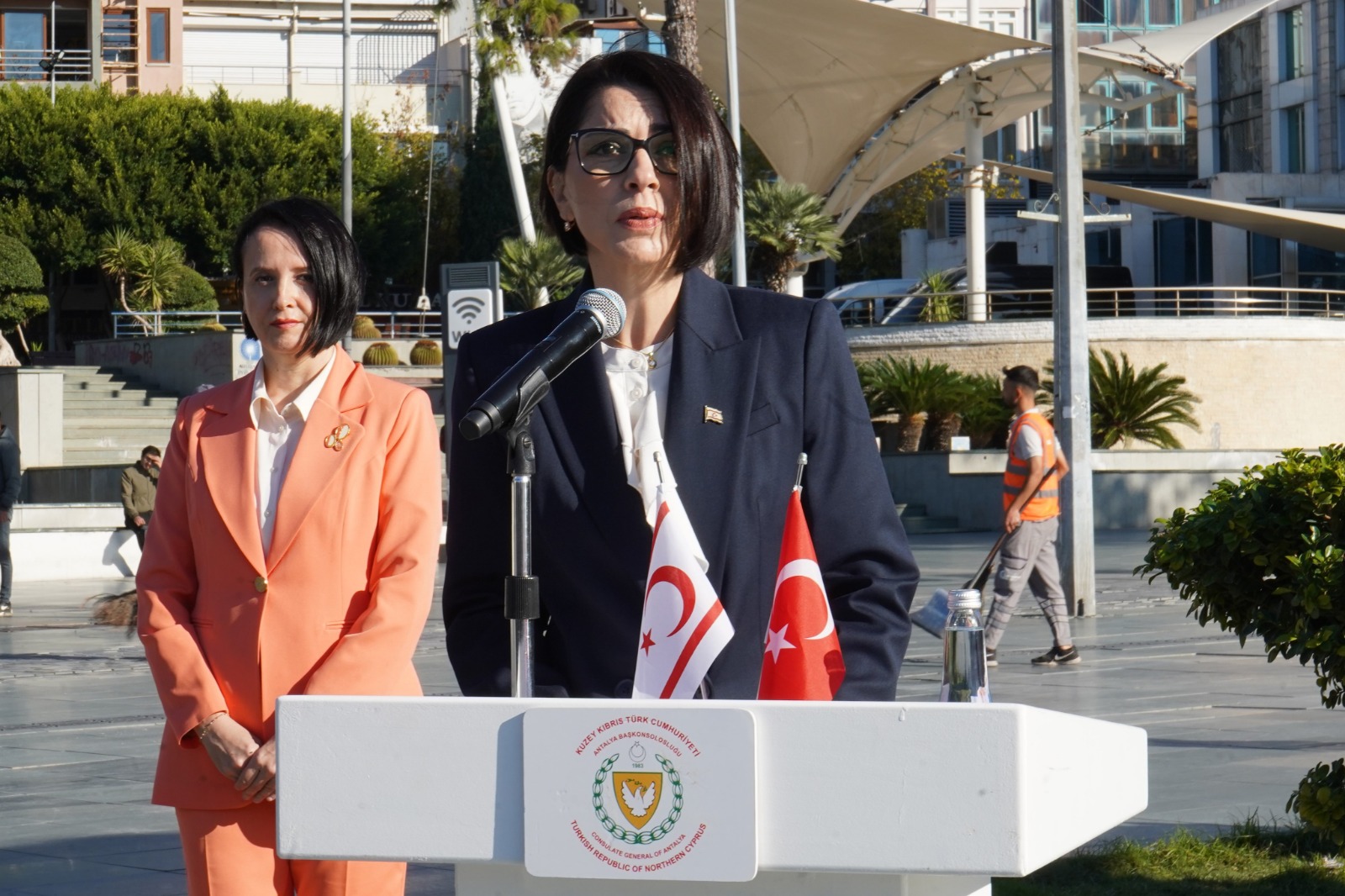 KKTC Antalya Başkonsolosu Aslı Erkmen, yaptığı konuşmada KKTC'nin kuruluş yıl dönümüne erişmenin gurur ve heyecanını yaşadıklarını belirtti. Erkmen, "Kıbrıs Türk halkının yıllarca en zor koşullar altında verdiği özgürlük, bağımsızlık ve varoluş mücadelesinin, kendi devletlerinin çatısı altında yaşama iradesiyle taçlandırdığı Kuzey Kıbrıs Türk Cumhuriyeti'nin 42'nci kuruluş yıl dönümüne erişmenin gururu ve heyecanını yaşıyorum. En büyük bayramımız olan Cumhuriyet Bayramı'mız kutlu olsun" dedi.