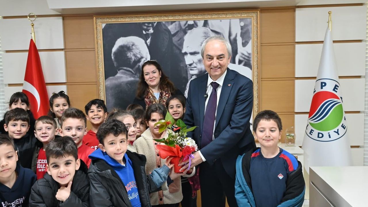 Kepez Belediye Başkanı Mesut Kocagöz, Bahçeşehir Koleji Park Orman Kampüsü 2. sınıf öğrencilerini makamda ağırladı. Hayat Bilgisi dersinde işlenen “Yönetim Birimlerini Tanıyorum” ünitesi çerçevesinde düzenlenen ziyarette öğrenciler, yerel yönetimlerin görev ve sorumluluklarını uygulamalı olarak görme imkanı elde etti. Başkan Kocagöz, önce belediyecilik hizmetlerine ilişkin bilgi verdi, ardından öğrencilerin sorularını yanıtladı. Çocuklara “Belediyeye gelirken nereden geldiniz? Oyunlarınızı nerede oynuyorsunuz? Mahallenizdeki çöp konteynerlerini kim temizliyor, ağaçları kim dikiyor?” gibi sorular yönelten Başkan Kocagöz, belediyenin çalışmaları hakkında şu açıklamalarda bulundu: “Geldiğiniz yolları yapıyoruz, oyun oynadığınız parkları düzenliyoruz, mahallenizdeki çöpleri topluyoruz. Sokağa çıktığınızda çevrenizi güzelleştiren ağaçları dikiyor ve bakımlarını yapıyoruz” dedi.