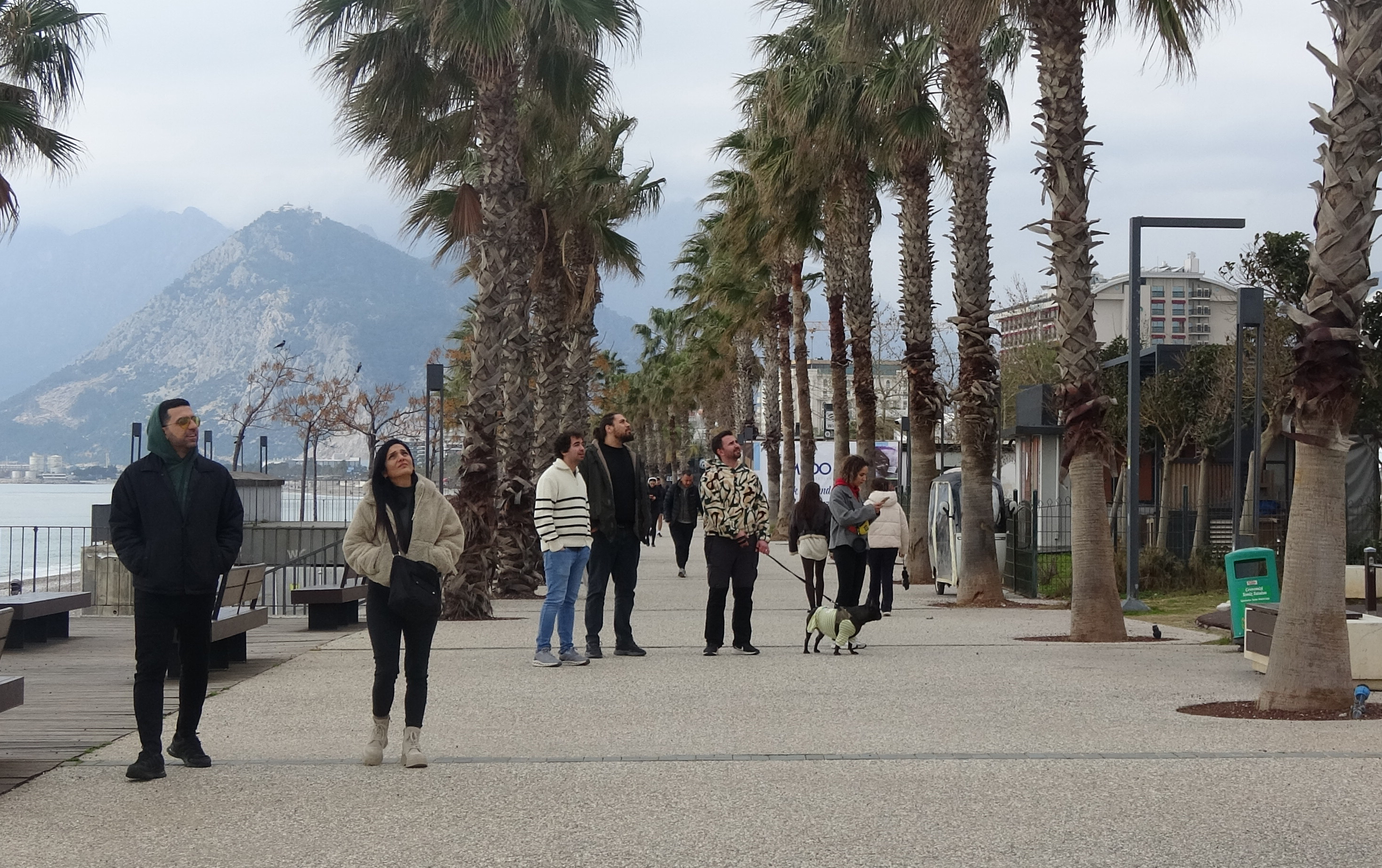 Antalya'da hava çok bulutlu ve yer yer yağışlı seyrederken gün içinde sıcaklık 17 dereceye kadar yükseldi. Nem oranın yüzde 80'e ulaştığı kentte, rüzgar ise zaman zaman etkili oldu. Kapalı havaya rağmen Konyaaltı Sahili'nde yürüyüşe çıkan yerli ve yabancı turistler, baharın müjdecisi olarak bilinen leylekle karşılaştı. Etrafında birkaç kuşla birlikte sahil üzerinden süzülen leylek, bir süre havada daire çizdikten sonra gözden kayboldu. Leyleği fark eden vatandaşlar gözlerini gökyüzüne çevirerek o anları izledi, bazıları ise cep telefonlarıyla görüntü almaya çalıştı.