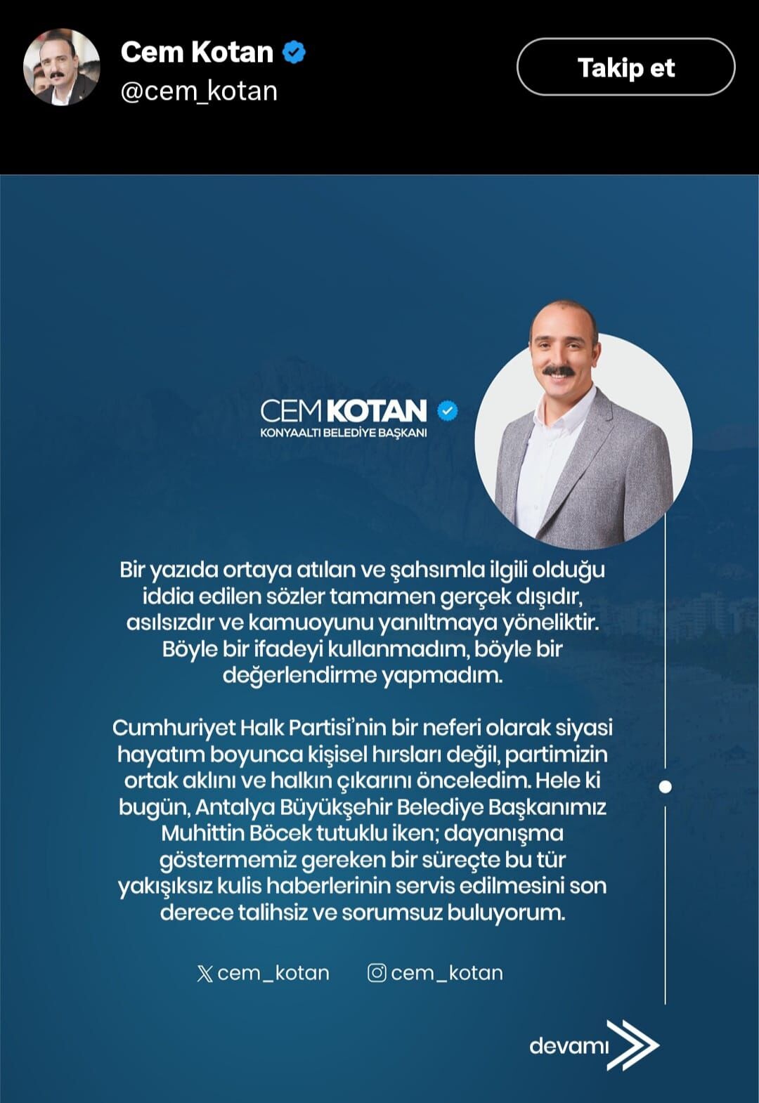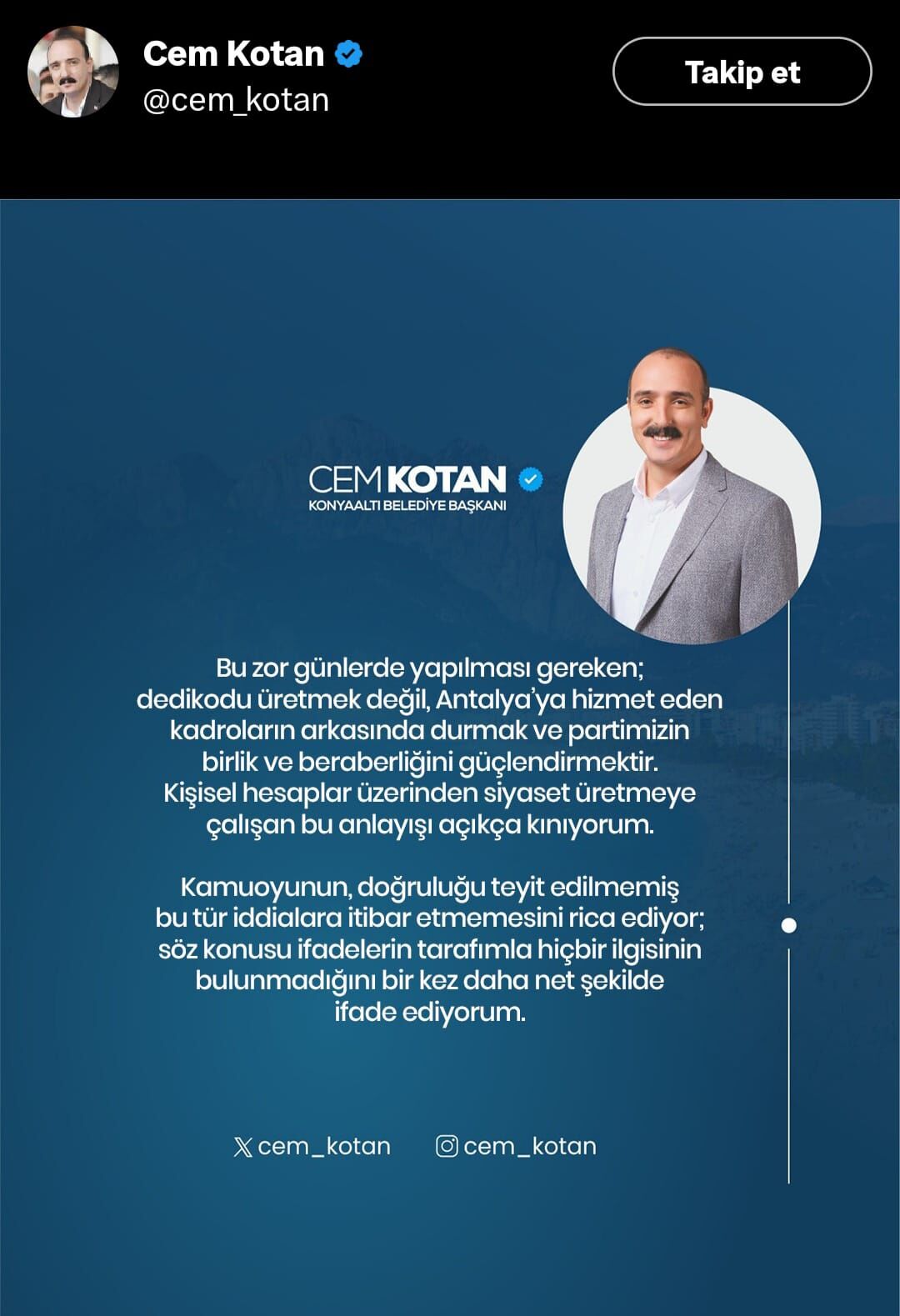 Konyaaltı Belediye Başkanı Cem Kotan, hakkında ortaya atılan kulis iddialarına sosyal medya üzerinden yaptığı açıklamayla yanıt verdi. Tutuklu Antalya Büyükşehir Belediye Başkanı Muhittin Böcek’in 16 Mart’ta hakim karşısına çıkacak olması ve görevden düşürülmesi halinde yerine aday gösterilmek için kulis yaptığı yönündeki iddiaların gerçeği yansıtmadığını belirten Kotan, söz konusu ifadelerin tamamen asılsız olduğunu söyledi.