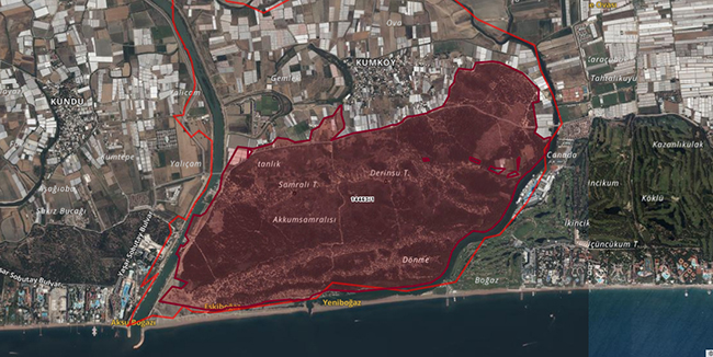 Eski muhtar İzzet Tekin, önceden Serik'e bağlı Kumköy'ün 5216 sayılı Büyükşehir Yasasıyla Aksu'ya bağlandığını belirterek, “Fıstıklık ve kumsal olarak tabir ettiğimiz davalı bir yerimiz var. Geçenlerde yangın olan yer. Burada 1952 yılında kadastro çalışması yapılıyor. Eski tapulara göre 11 milyon metrekare gözüküyor ancak o günkü şartlarda ölçümler yanlış yapılmış ve yeniden yapılan ölçümlere göre 8 milyon 37 bin metrekare. Köylüye tapulanıyor. Ama o gün bugündür kadastro mahkemesi devam ediyor. Hala bir sonuca ulaşılmış değil. Köylünün üzerine tapulanmış bir yer" dedi.