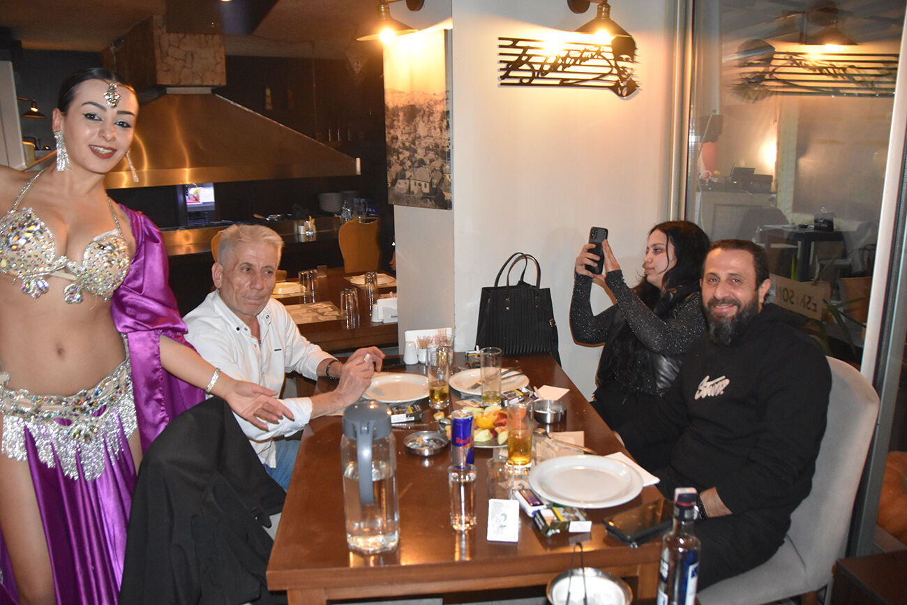 Gecede çalan hareketli şarkılarla yerlerinde duramayan ikili, eğlencenin dozunu bir an olsun düşürmedi. Masada dansöz oynatarak geceye renk katan Nurten Ayhan ve Mustafa, enerjileriyle dikkat çekti.