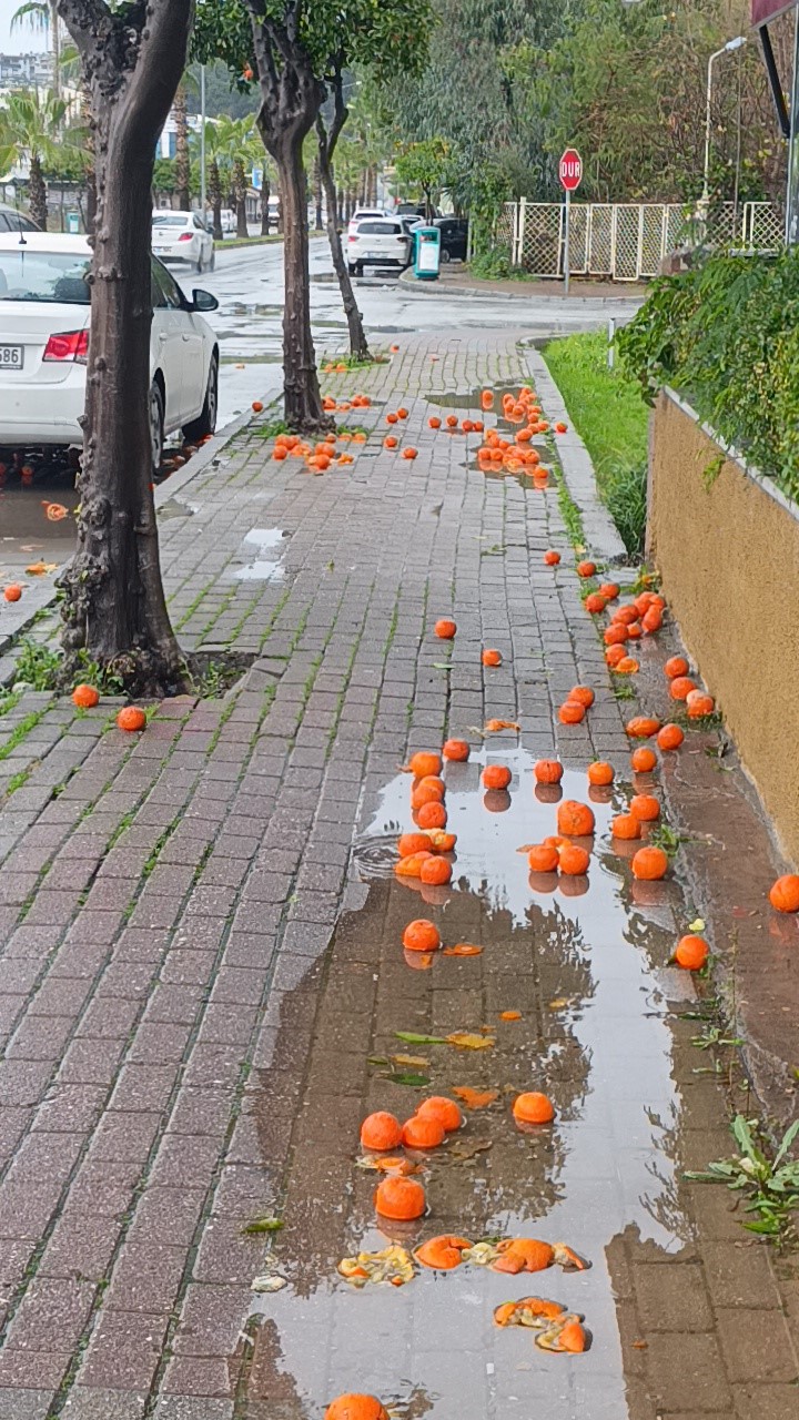 Vitamin ve mineral bakımından zengin içeriğiyle bilinen, ancak büyük bölümü toplanmadan ağaç üzerinde kalan, bazı vatandaşların reçel yapmak amacıyla topladığı turunçlar, ilçede etkili olan şiddetli yağmur ve fırtınanın etkisiyle kaldırım ve yollara savruldu. Etrafa saçılan meyveler düştüğü alanları turuncu renge bürürken, yola dağılan turunçların araçların tekerlekleri altında ezildiği görüldü.