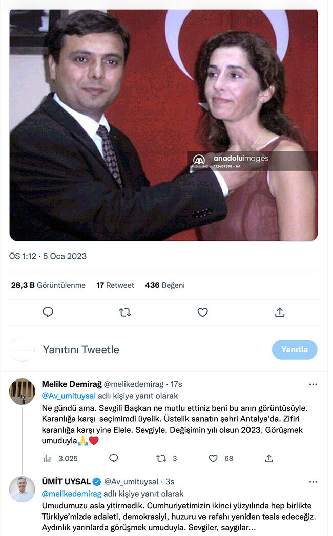 Muratpaşa Belediye Başkanı Ümit Uysal, CHP Antalya il başkanlığı yaptığı yıllardan, 5 Ekim 2002’de oyuncu ve şarkıcı Melike Demirağ’a parti rozetini takarken çekilen ve Anadolu Ajansı arşivinde de yer alan fotoğrafı sosyal medya hesaplarından paylaştı. Yılmaz Güney’in Arkadaş filminde seslendirdiği Arkadaş şarkısıyla tanınan, 12 Askeri Darbesi’nin ardından 11 yıl yurtdışında yaşamak zorunda kalan Demirağ, binlerce kez görüntülenen paylaşıma sosyal medya hesaplarından karşılık verdi. “Ne gündü ama” diyen Demirağ, paylaşımına “Karanlığa karşı bir seçimde üyelik. Üstelik sanatın şehri Antalya’da. Zifiri karanlığa karşı yine el ele, sevgiyle. Değişimin yılı olsun 2023” diye yazdı. Başkan Uysal ise Demirağ’ın bu sözlerine “Umudumuzu asla yitirmedik. Cumhuriyetimizin ikinci yüzyılında hep birlikte Türkiye’mizde adaleti, demokrasiyi, huzuru ve refahı yeniden tesis edeceğiz. Aydınlık yarınlarda görüşmek umuduyla” diye karşılık verdi.