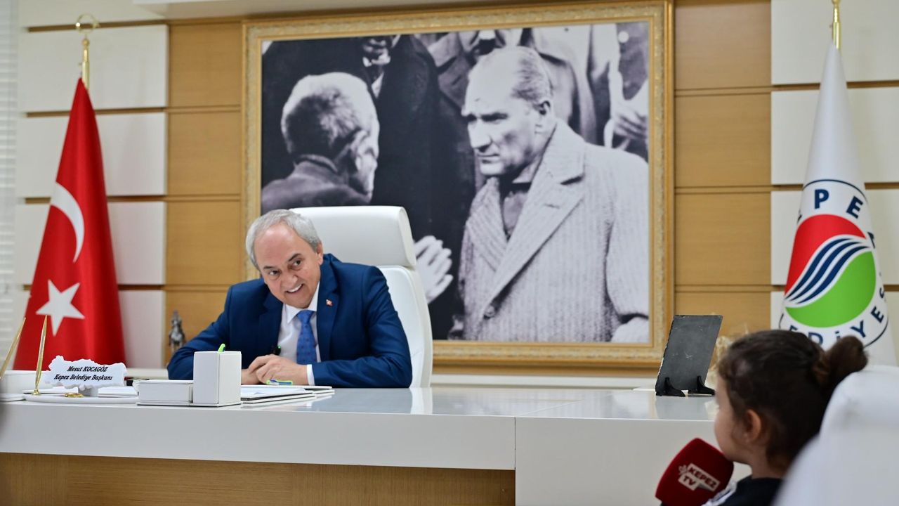 Ünsal Anaokulu öğrencileri, 10 Kasım Atatürk’ü Anma Günü etkinlikleri kapsamında Kepez Belediye Başkanı Mesut Kocagöz’ü makamında ziyaret etti. Öğrencileri sevgiyle karşılayan Başkan Kocagöz, ‘Çocuklar hoş geldiniz’ diyerek isimlerini ve yaşlarını sorduğu minik misafirleriyle yakından ilgilendi. Minik ziyaretçiler, Atatürk’le ilgili merak ettikleri soruları Başkan Kocagöz’e ilettiler. En sevdiği yemekten çiçeğe, tuttuğu takımdan ilke ve inkılaplarına kadar Atatürk’ün merak edilen pek çok yönünü öğrenmek için sorular yönelttiler.