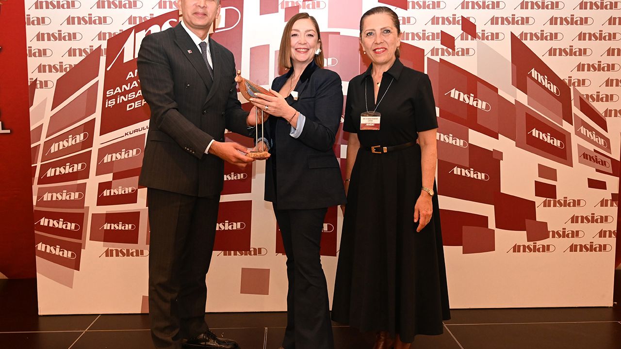 ANSİAD 14. Olağan Toplantısı, soru ve cevapların ardından ANSİAD Yönetim Kurulu Başkanı Ercan Özbek'in Arzu Kaprol'e Antalyalı seramik sanatçısı Tufan Dağıstanlı'nın seramik kuşu hediye takdimiyle sona erdi.