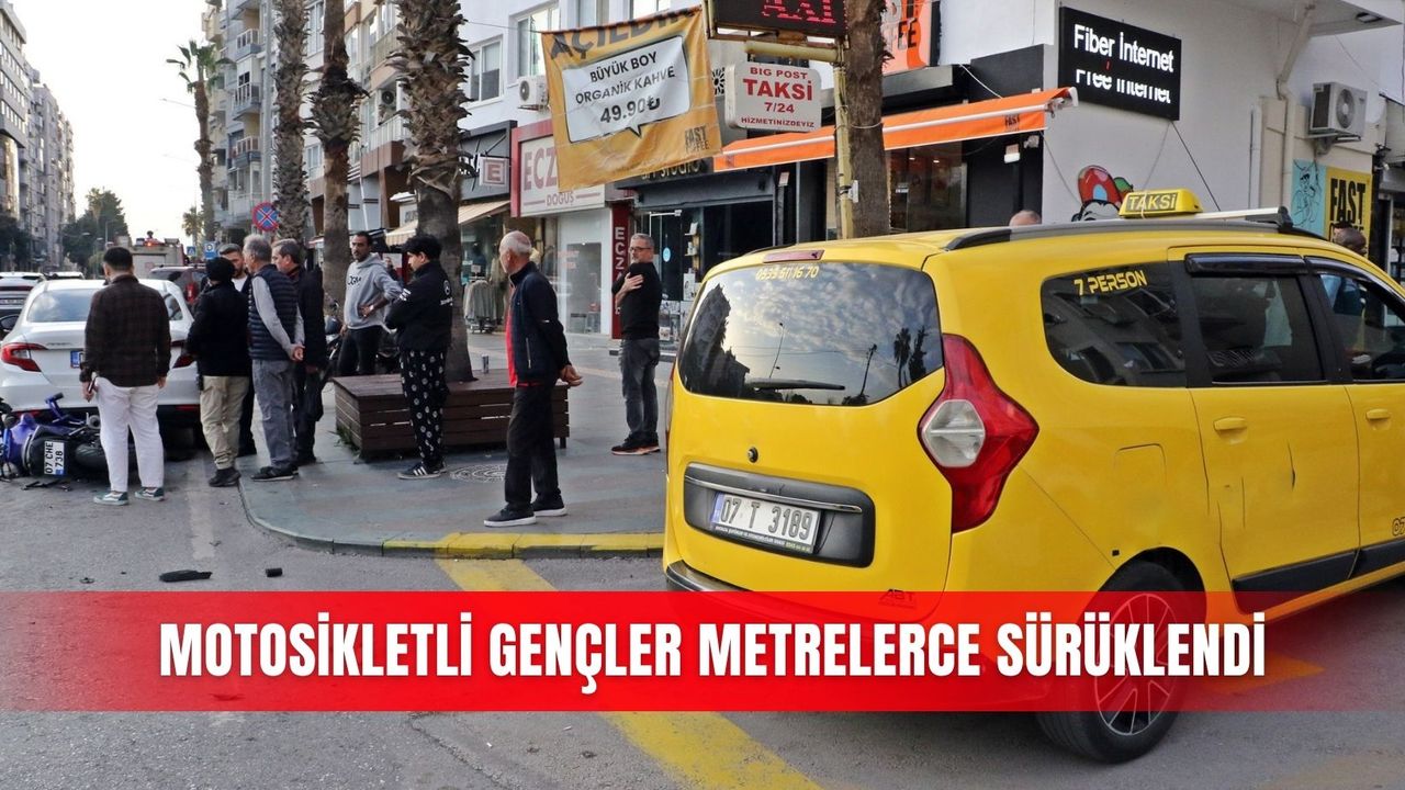 Kaza, dün saat 17.00 sıralarında Muratpaşa ilçesine bağlı Deniz Mahallesi Konyaaltı Caddesi üzerinde meydana geldi. Edinilen bilgiye göre, Ahmet E. (46) idaresindeki 07 T 3189 plakalı ticari taksi sola dönüş yapacağı sırada karşı yönden gelen Zekeriya K.’nın (19) kullandığı 07 CHE 738 plakalı motosikletle çarpıştı. Çarpmanın etkisiyle motosiklet sürücüsü ile arkasındaki ismi öğrenilemeyen genç yola savruldu. Motosiklet ise sürüklenerek park halindeki 07 AAY 020 plakalı aracın altına girdi. Çevredekilerin ihbarı üzerine olay yerine polis, itfaiye ve sağlık ekipleri sevk edildi. Sağlık ekipleri, yaralanan motosikletteki iki genci, ilk müdahalelerinin ardından ambulansla hastaneye götürdü.