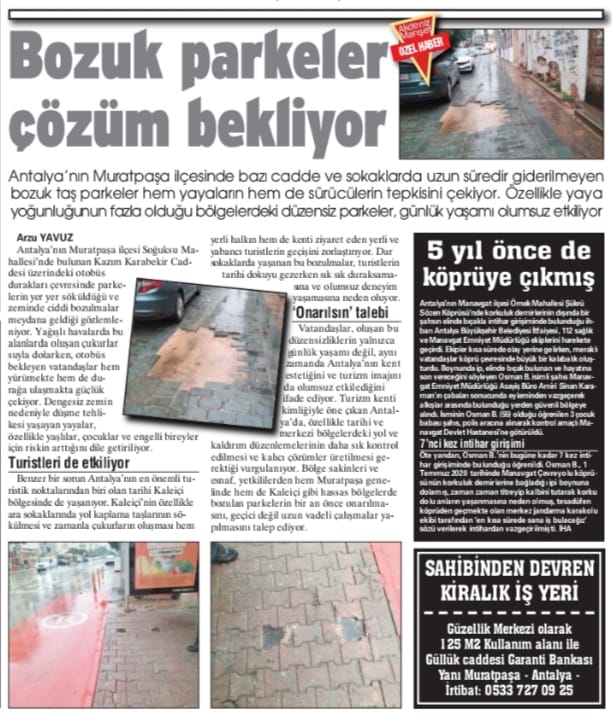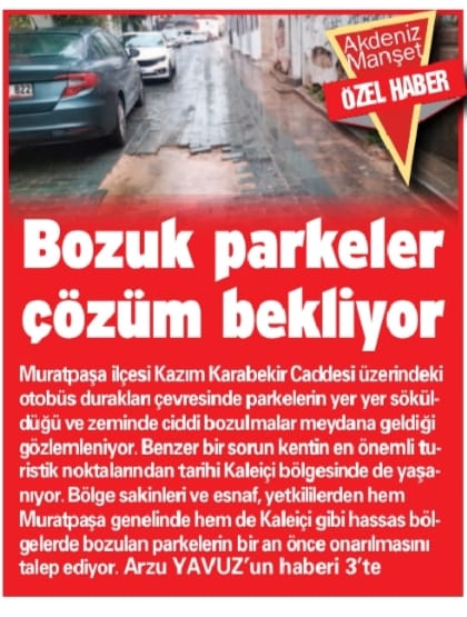 Bölge sakinleri ve esnaf, bozuk parkelerin yalnızca günlük yaşamı değil, aynı zamanda Antalya’nın kent estetiğini ve turizm imajını da olumsuz etkilediğini ifade ediyor. Turizm kenti kimliğiyle öne çıkan Antalya’da, özellikle merkezi ve yoğun kullanılan bölgelerde yol ve kaldırım düzenlemelerinin daha sık denetlenmesi gerektiği vurgulanıyor. Vatandaşlar, Muratpaşa genelinde bozulan parkelerin geçici müdahalelerle değil, kalıcı ve uzun vadeli çözümlerle onarılmasını talep ediyor. Soğuksu Mahallesi Kazım Karabekir Caddesi’ndeki otobüs durakları çevresinde yaşanan sorunun da bir an önce giderilmesi bekleniyor.