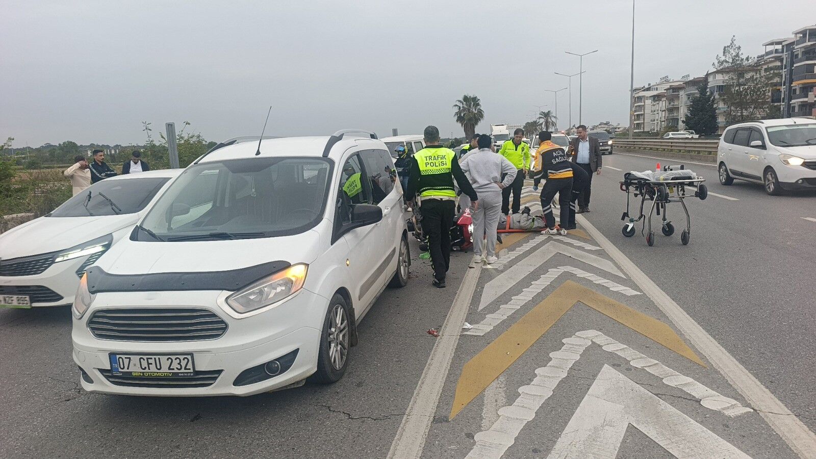 Kaza, Antalya-Alanya D-400 kara yolunda meydana geldi. Alınan bilgiye göre, Mustafa Alperen T.'nin kullandığı 07 BYC 280 plakalı motosiklet, Sanayi Köprülü Kavşak yan yol girişinde kırmızı ışıkta bekleyen Dürdane K.'nin kullandığı 07 CFU 232 plakalı hafif ticari araca arkadan çarptı. Motosiklet sürücüsü, çarpmanın şiddetiyle başını hafif ticari aracın arka camına çarparak, başındaki kask sayesinde ölümden döndü. Yaralanan ve yerde yatan motosiklet sürücüsünün yardımına kazayı gören araç sürücüleri koştu. Motosikletli Mustafa Alperen T. kazanın şokuyla kendisine yardım eden vatandaşların elini tutarak sürekli, 'Ben nasıl kaza yaptım abi, ben nasıl kaza yaptım' diye sordu.