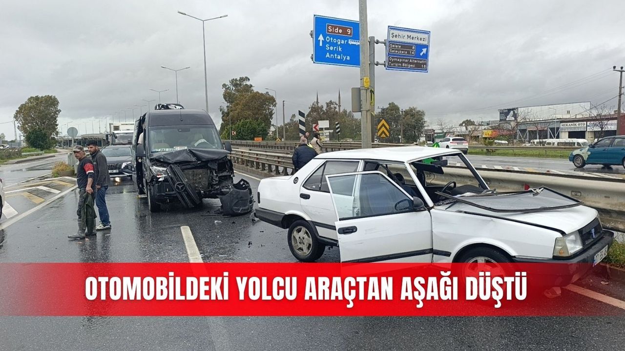 Kaza, Antalya'nın Manavgat ilçesi D-400 Karayolu Sanayi Köprülü Kavşağında meydana geldi. Edinilen bilgilere göre Antalya istikametinden Alanya yönüne seyir halinde olan Mutlu Y. idaresindeki 07 BMT 115 plakalı Mercedes marka tur minibüsü, Manavgat Çevreyolu Sanayi Köprülü Kavşağı çıkışında aniden önüne çıkan Mehmet Ali T. yönetimindeki 07 ES 464 plakalı Tofaş marka otomobille çarpıştı. Çarpmanın etkisiyle savrulan otomobil refüjdeki bariyerlere çarparken, araçtan yola düşen sürücü Mehmet Ali T. yaralandı. İhbar üzerine olay yerine gelen 112 Acil Sağlık ekipleri tarafından ilk müdahalesi yapılan yaralı sürücü, ambulansla Manavgat Devlet Hastanesi'ne kaldırılırken, kaza anı güvenlik kamerasına saniye saniye yansıdı.