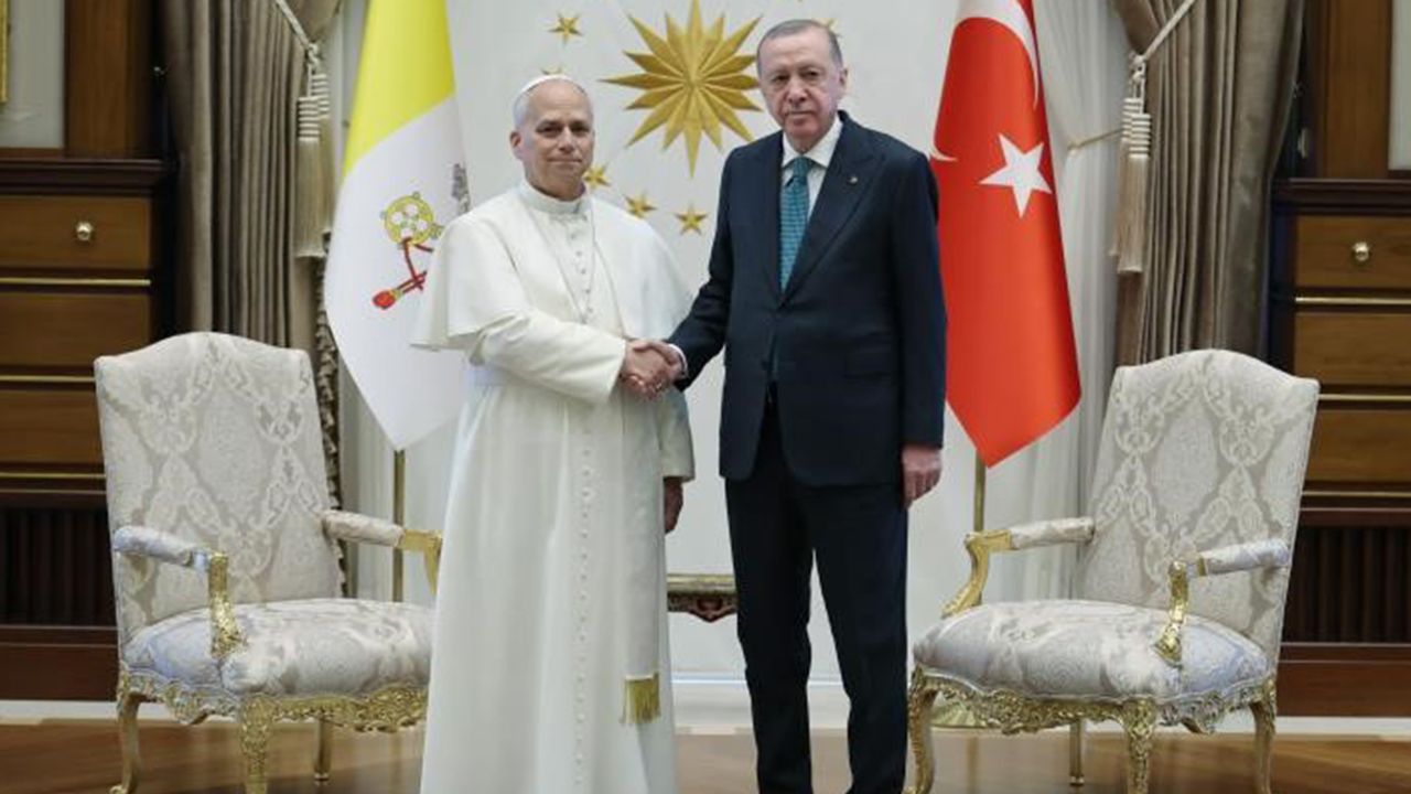 Cumhurbaşkanı Recep Tayyip Erdoğan ile Papa 14. Leo, Cumhurbaşkanlığı Millet Kütüphanesi Cihannüma Salonu'nda düzenlenen Sivil Toplum ve Diplomatik Heyet Toplantısı'nda bir araya geldi. Cumhurbaşkanı Erdoğan konuşmasında, Papa'nın ilk yurt dışı ziyaret durağı olarak Türkiye'yi tercih etmesinin önemine dikkat çekti. Erdoğan, "Farklı kültürlerin bir arada barış içinde yaşadığı bir medeniyetin mirasçılarıyız. Küresel barış ve istikrar için üzerimize düşeni yapmaya devam edeceğiz. İnsanlık ailesi olarak Filistin halkına en büyük borcumuz adalettir, bu borcu ödemenin yolu ise 1967 sınırları temelinde iki devletli çözüm vizyonunu bir an önce hayata geçirmektir. Bunun için öncelikle Gazze'de varılan ateşkesin tahkim edilmesi, sivillerin güvenliğinin teminat altına alınması ve insani yardımların kesintisiz biçimde Gazze'ye ulaştırılması gerekiyor" ifadelerini kullandı.