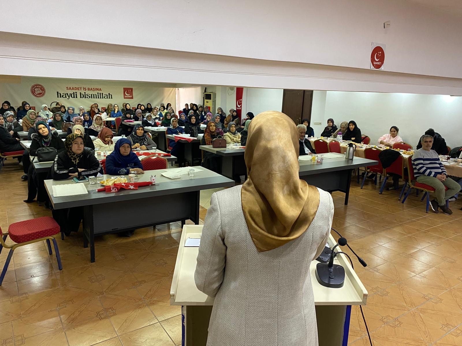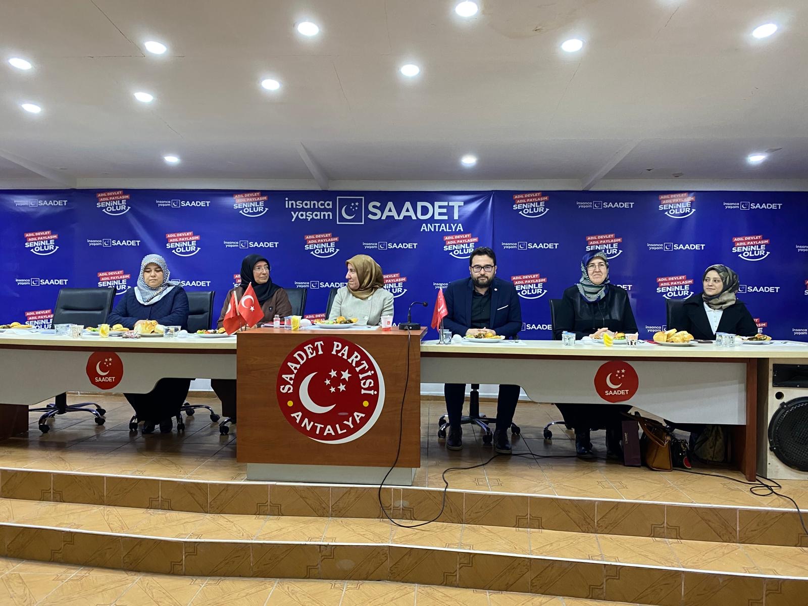 Saadet Partisi (SP) Antalya Kadın Kollarının İl Divan Toplantısı, SP Kadın Kolları Genel Başkanı Nurgül Beytiye Ekinci’nin katılımıyla gerçekleştirildi. Toplantıya SP Antalya İl Kadın Kolları Başkanı Zübeyde Güler’in yanı sıra SP Genel Başkan Yardımcısı Hülya Karpınar, SP İl Başkanı Mehmet Fatih Tekin ve partililer katıldı. ‘İktidar, bilerek ve isteyerek bozulan ekonomik düzenin ardından pek çok şeyi de bozdu’ diyen Ekinci, “Bu bozulma en çok aile kurumunu etkiledi. Mevcut aileler dağılma tehlikesi ile karşı karşıya iken gençler yeni aile kuramıyor. 2025 yılını Aile Yılı ilan ettiler. Ama bu hamleler artık işe yaramıyor. Çünkü artık neresinden tutsan dökülüyor. Aile meselesinde başta şunu ifade etmek gerekiyor; sabah kuşağı programları başta olmak üzere televizyon içeriklerinin çoğu aile yapısının altına adeta dinamit döşüyor. O gündüz kuşağı programlarında sadece şiddet, ihanet, aldatma hikayeleri var. Bununla tek bir mücadele yöntemi var; bu yayınları durdurmak. Öte yandan çetelere emanet edilen sokaklarda ölüm kol geziyor. Sokak ortasında filmlerde bile görmediğimiz cinayet işleniyor. Hukuka güvenen, devlete sığınan, emniyet birimlerine şikayet edenler değil; silahına hızlı davrananlar hayatta kalıyor” ifadelerini kullandı.