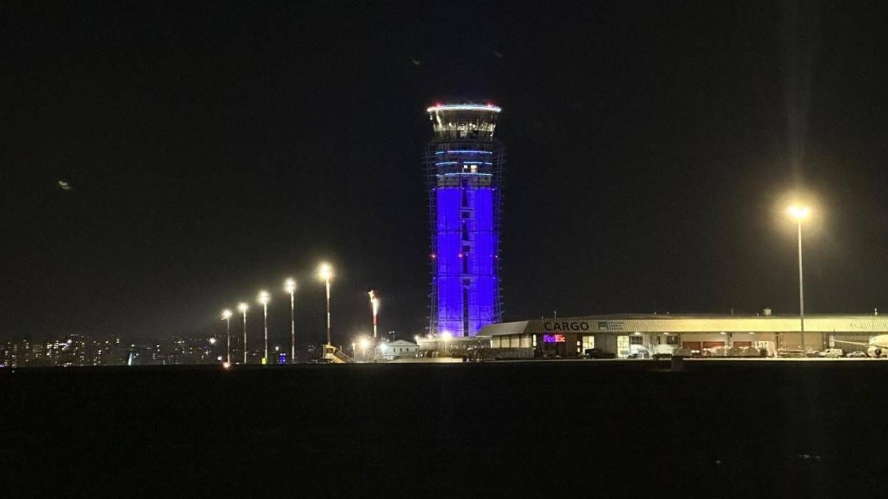 Sabiha Gökçen Havalimanının simgesi olan kule, mavi renge büründü.