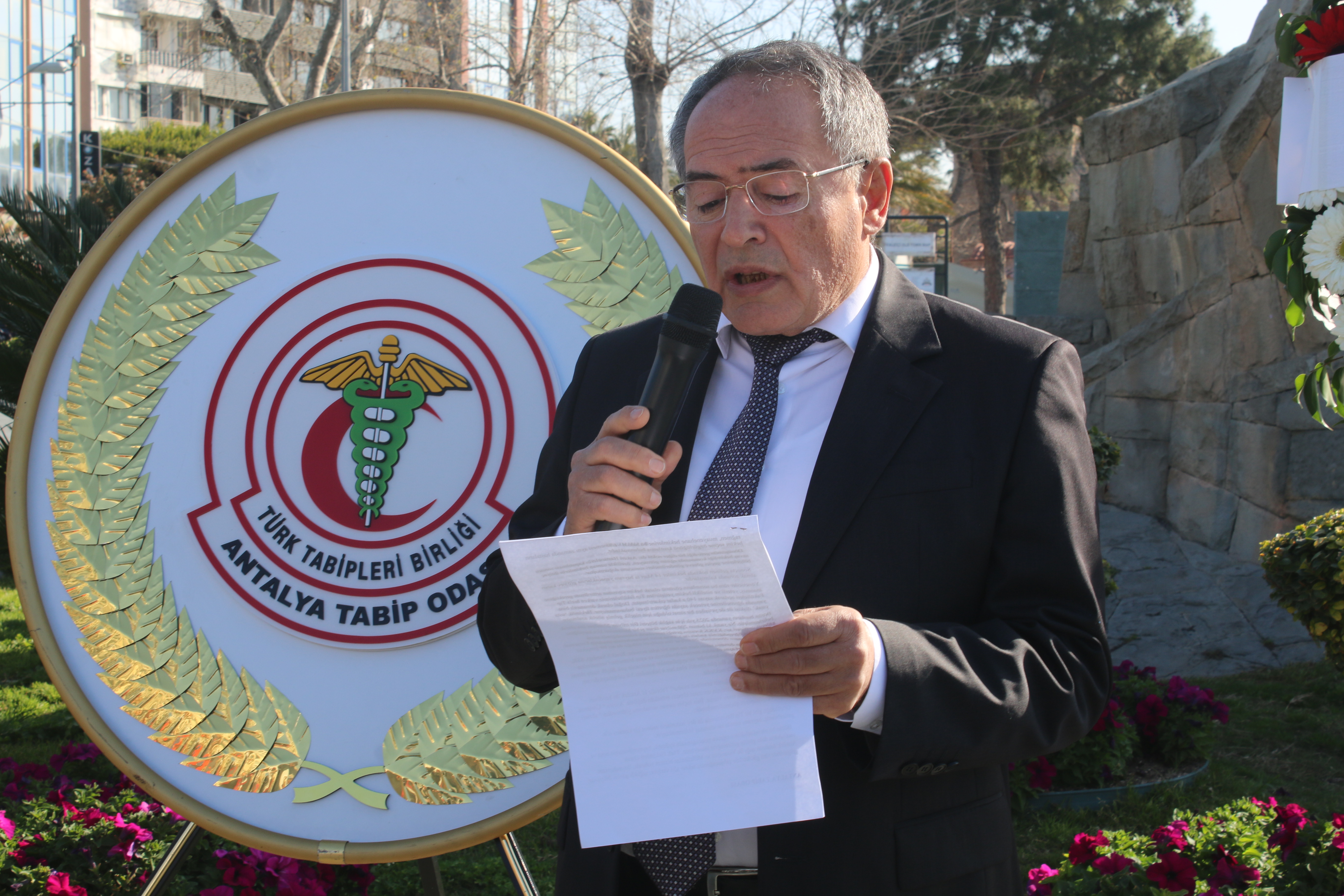 14 Mart Tıp Bayramı etkinlikleri kapsamında Cumhuriyet Meydanı'nda toplanan Antalya Tabip Odası üyeleri Atatürk Anıtı'na çelenk sunma merasiminin ardından basın açıklaması gerçekleştirdi. Açıklamayı okuyan Antalya Tabip Odası Başkanı Hüseyin Can Öztürk, Kurtuluş Savaşı sonrası kurulan Türkiye Cumhuriyeti'nin her alanda olduğu gibi sağlık alanında da büyük atılımlar gerçekleştirdiğini dile getirerek,"Ne yazık ki 82 Anayasası ile sağlık hizmeti asli görev olmaktan çıkarılmış, devleti düzenlemeci yapmıştır. 'Sağlıkta Dönüşüm Programı' hayata geçirildikten sonra sosyal hukuk devleti olan ülkemizin sosyal yönlerinden birisi olan sağlık ticari alana evrilmiştir. Hastalar müşteri olarak değerlendirilmeye başlanılmıştır. Hekim hasta arası kurulan bağlar zayıflamış adeta makineleşmiştir. Bunun yanında 200 bini aşan sayısı ile sağlık sistemimizin lokomotifi durumundaki hekimlerin sorunları çığ gibi büyümüştür. Bu dönüşümün bir sonucu da hekime ve sağlık çalışanlarına şiddet sayısı hızla artmıştır. Türk milletinin içerisinden çıkan hekimlere yapılan saldırılar nerede ise kanıksanmış, can kayıpları yaşanmıştır. Hekimlerin tanı ve tedavide ilk olarak 'zarar verme' sonra gerekeni yaparsın prensibinden yola çıktıkları da unutulmuştur" diye konuştu.