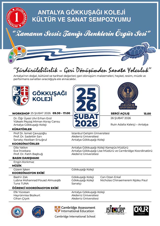 Sempozyum takvimi hem akademik hem de uygulamalı çalışmaları kapsayan yoğun bir program sunuyor. Program kapsamında; Atölye Çalışmaları (Workshop), 25 Şubat 2026 tarihinde Muratpaşa Gökkuşağı Koleji kampüsünde gerçekleşecek. Usta sanatçılar ile genç yetenekler, 09:30 – 17:00 saatleri arasında geri dönüşüm malzemeleriyle doğa temelli üretimler yapacak. Sempozyumun finali, 26 Şubat saat 17.00’da Kaleiçi’nin tarihi atmosferinde, Ruin Adalya Hotel’de yapılacak. Sürdürülebilirlik temalı eserler, tarih ve sanatın iç içe geçtiği bu özel mekanda sanatseverlerle buluşacak.