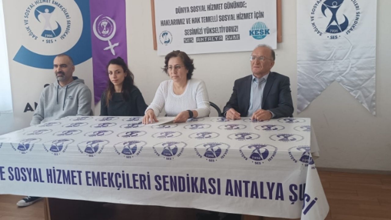 Sağlık ve Sosyal Hizmet Emekçileri Sendikası (SES) Antalya Şubesi Eş Başkanı Şükran İçöz, Dünya Sosyal Hizmet Günü ile ilgili konuşarak biriken sorunlara dikkat çekti. İçöz, “Sosyal Hizmet Günü’nü sosyal hizmet emekçileri de biriken sorunlarla karşılamaktadır. Sendikamız tarafından daha önceden yapılan anket çalışmasında açıkça işaret ettiği gibi sosyal hizmet emekçileri personel eksikliği ile az çalışan ile çok fazla iş yaparak, uzun sürelerle çalışarak, güvencesiz biçimde ve farklı istihdam biçimleri altında çalıştırılarak, yetersiz ücretlerle, yaygın biçimde şiddete uğrayarak, mobbing problemi altında, yemek ve yol sorununun dahi çözülmediği bir ortamda, yetersiz ekonomik sosyal haklarla, mesleki anlamda ihtiyaçlarının karşılanmadan ve çalışma koşulları giderek kötüleşerek çalışmaktadır” dedi. Başkan İçöz, taleplerini hatırlatarak, “Aile ve Sosyal Hizmet Bakanlığının merkez teşkilatı ile taşra teşkilatları arasında kopukluk ortadan kaldırılmalıdır. İdarecilerin belirlenmesinde atamalar siyasi yakınlığa göre değil liyakate göre yapılmalıdır. Sosyal çalışma görevlisi tanımı kaldırılmalıdır. Yoksulluk sınırı üzerinde ve eşit işe eşit ücret politikası uygulanmalıdır.Tüm ücretler emekliliğe yansıtılmalıdır. Sosyal hizmet emekçilerinin yaptıkları iş ‘riskli iş grubuna’ alınmalı ve sosyal hizmet tazminatı ve yıpranma payı uygulaması hayata geçirilmelidir. Sosyal hizmet emekçilerinin yandaş sendika nedeniyle TİS’te yaşadıkları kayıplar giderilmelidir. Hafta sonları çalıştırılan sosyal hizmet emekçilerine fazla mesai ücreti ödenmelidir. Sosyal hizmet emekçileri için 7/24 ücretsiz kamusal kreş hizmeti sağlanmalıdır” diye konuştu.