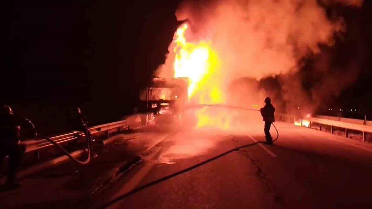 Yangın, gece saatlerinde Erzin Organize Sanayi Bölgesi'nde yaşandı. Seyir halindeki tır alevlere teslim olarak yanmaya başladı. Kısa sürede alevlerin yükseldiği tıra itfaiye ekipleri müdahale etti. Ekiplerin müdahalesiyle kontrol altına alınan alevler, dorse kısmına sirayet etmeden söndürüldü. Yangında can kaybı ve yaralanma yaşanmazken tır kullanılmaz hale geldi.